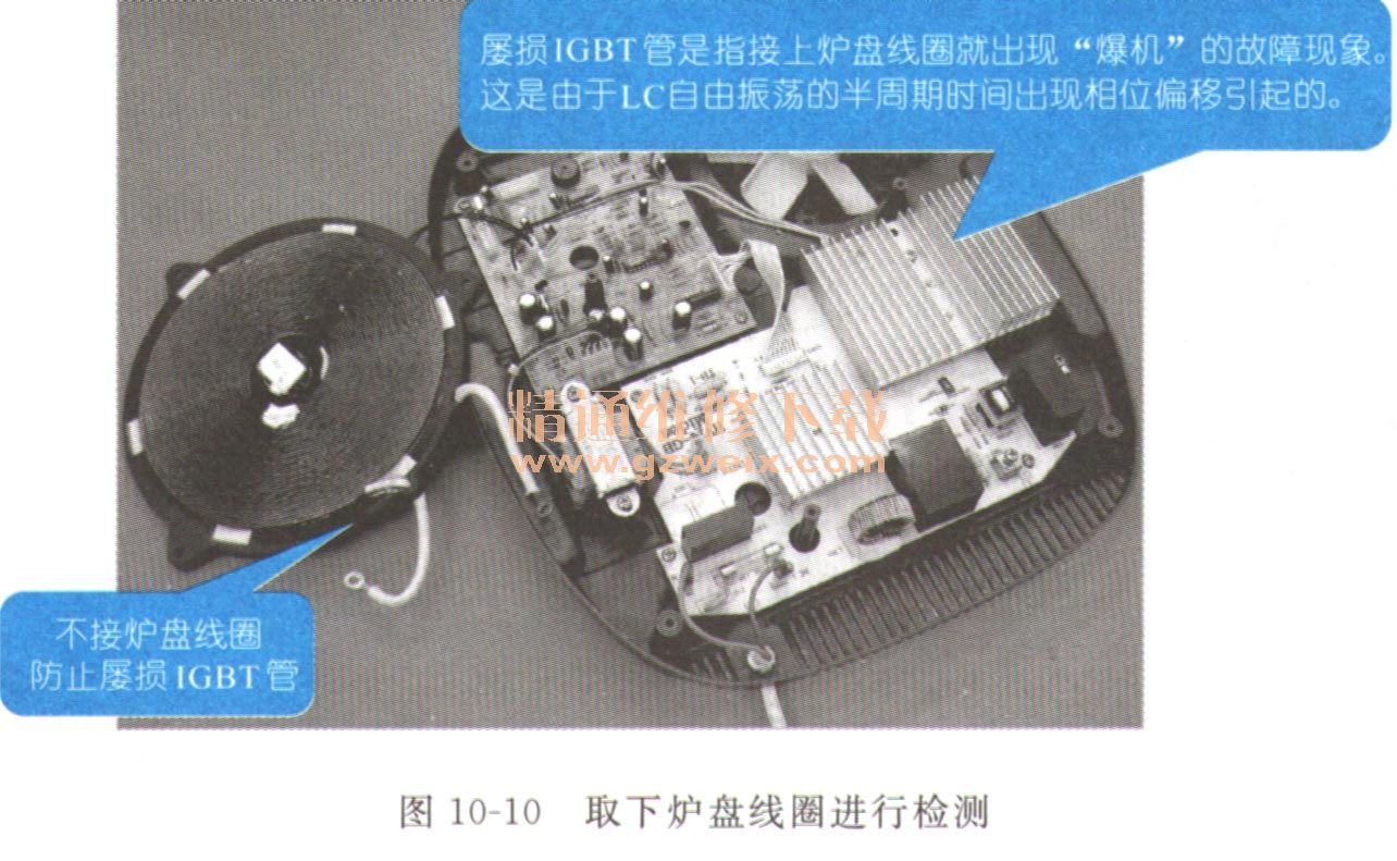 (1)由于IGBT管(門控管)屢次被擊穿燒壞,因此檢測時,應(yīng)將爐盤線圈取下來,如圖10-10所示。