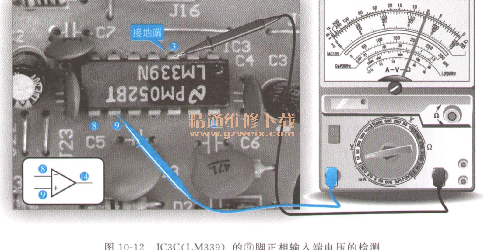(5) IC3C(LM339)的14腳是同步振蕩電路的輸出腳,為PWM調(diào)制電路提供鋸齒波形,使用萬用表測量電壓值,應(yīng)有0. 21V左右,如圖10-13所示。