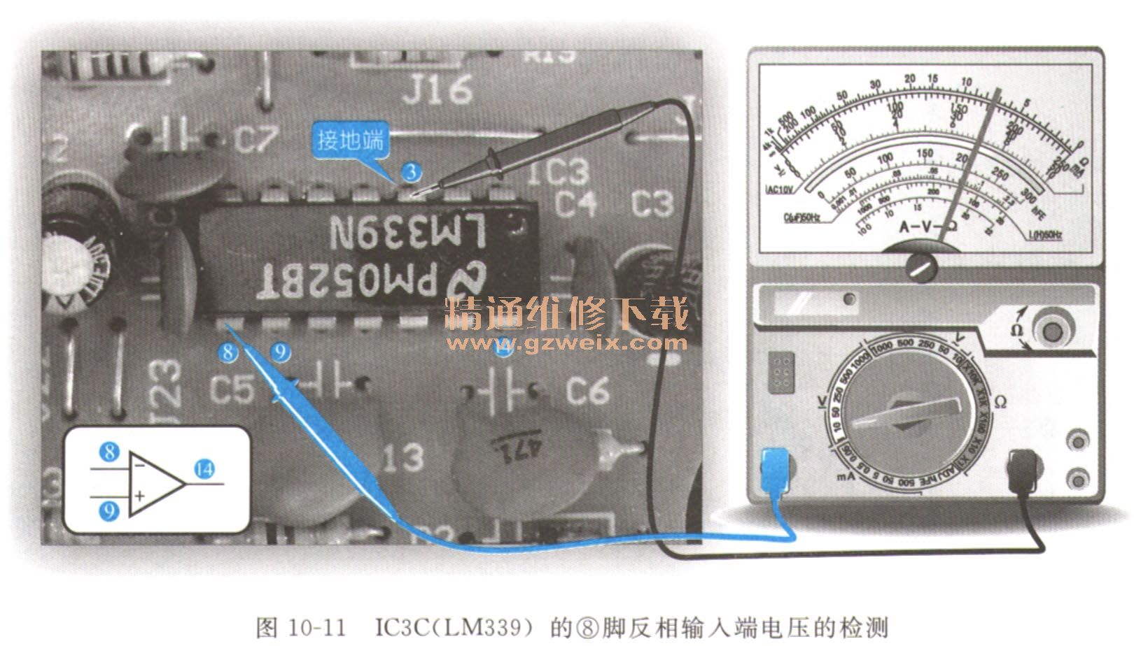(2) IC3C(LM339)的⑧腳接收的電壓值為爐盤線圈+300V電源側(cè)取樣電壓,經(jīng)分壓電阻后,在⑧腳處應(yīng)檢測到7V左右的電壓,如圖10-11所示。