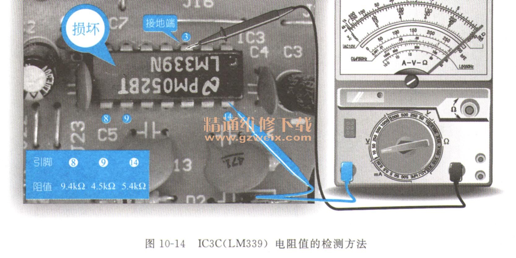 檢測同步振蕩電路是否正常,除了使用萬用表檢測各引腳的電壓值以外,還可以通過檢測電阻值進行判斷,如圖10-14所示。