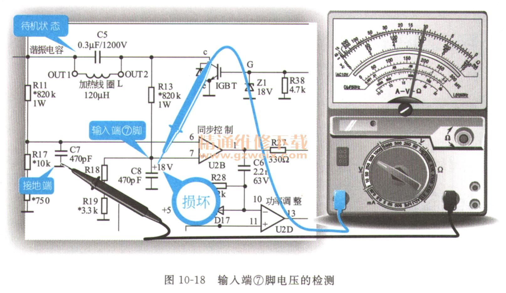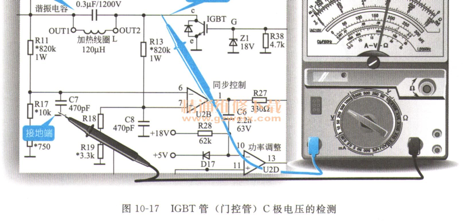 (2)在待機狀態(tài)下,使用萬用表檢測功率輸出電路中的IGBT管(門控管)C極的電壓,如圖10-17所示。經(jīng)檢測,發(fā)現(xiàn)有310V電壓,排除了功率輸出電路以及IGBT驅(qū)動電路的故障。