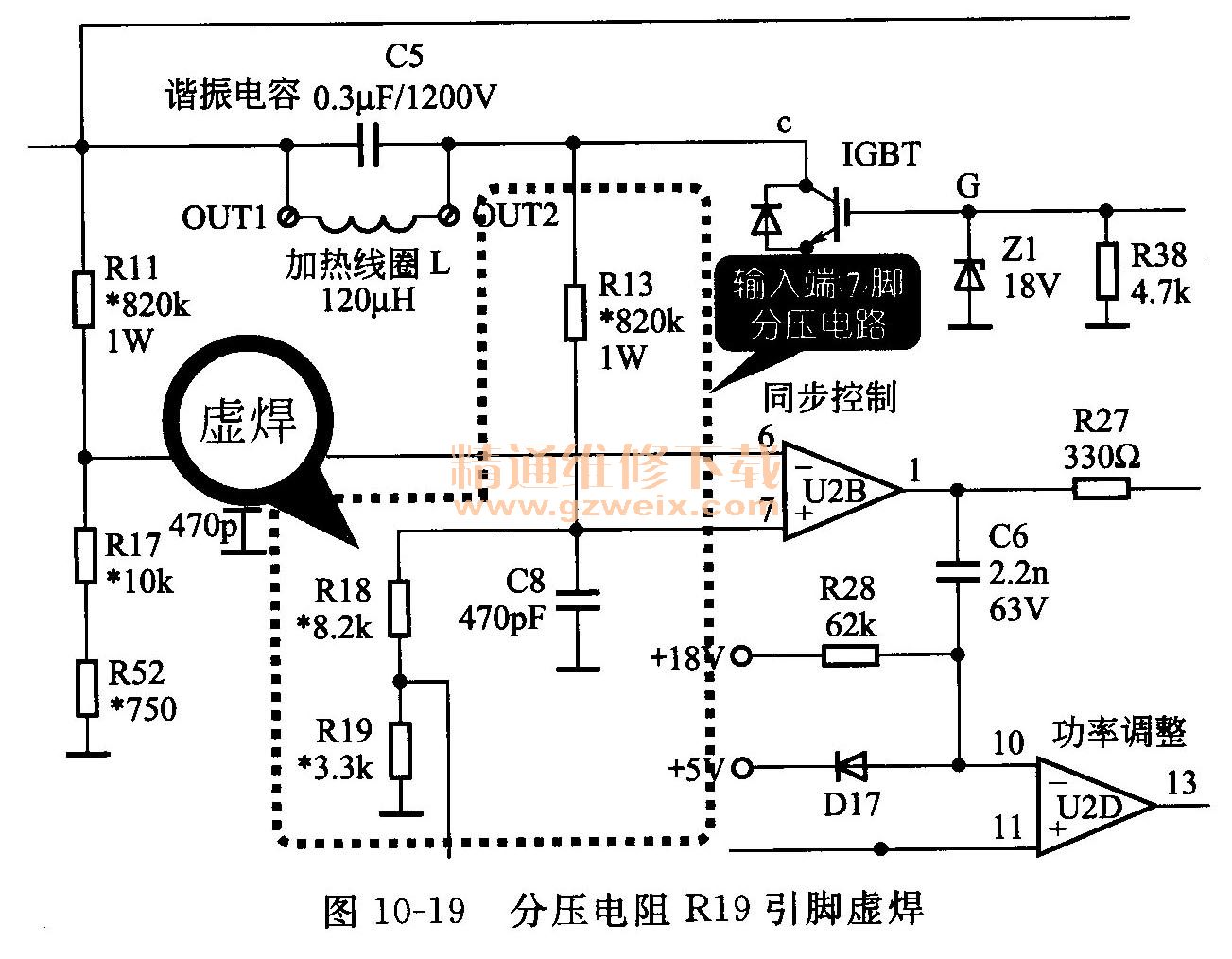 (4)輸入端⑦腳的分壓電阻有R13、R18、R19,使用“觀察法”發(fā)現(xiàn)電阻R19的焊點有虛焊現(xiàn)象,如圖10-19所示,因此造成了電磁爐時好時壞、斷續(xù)加熱的故障現(xiàn)象。
