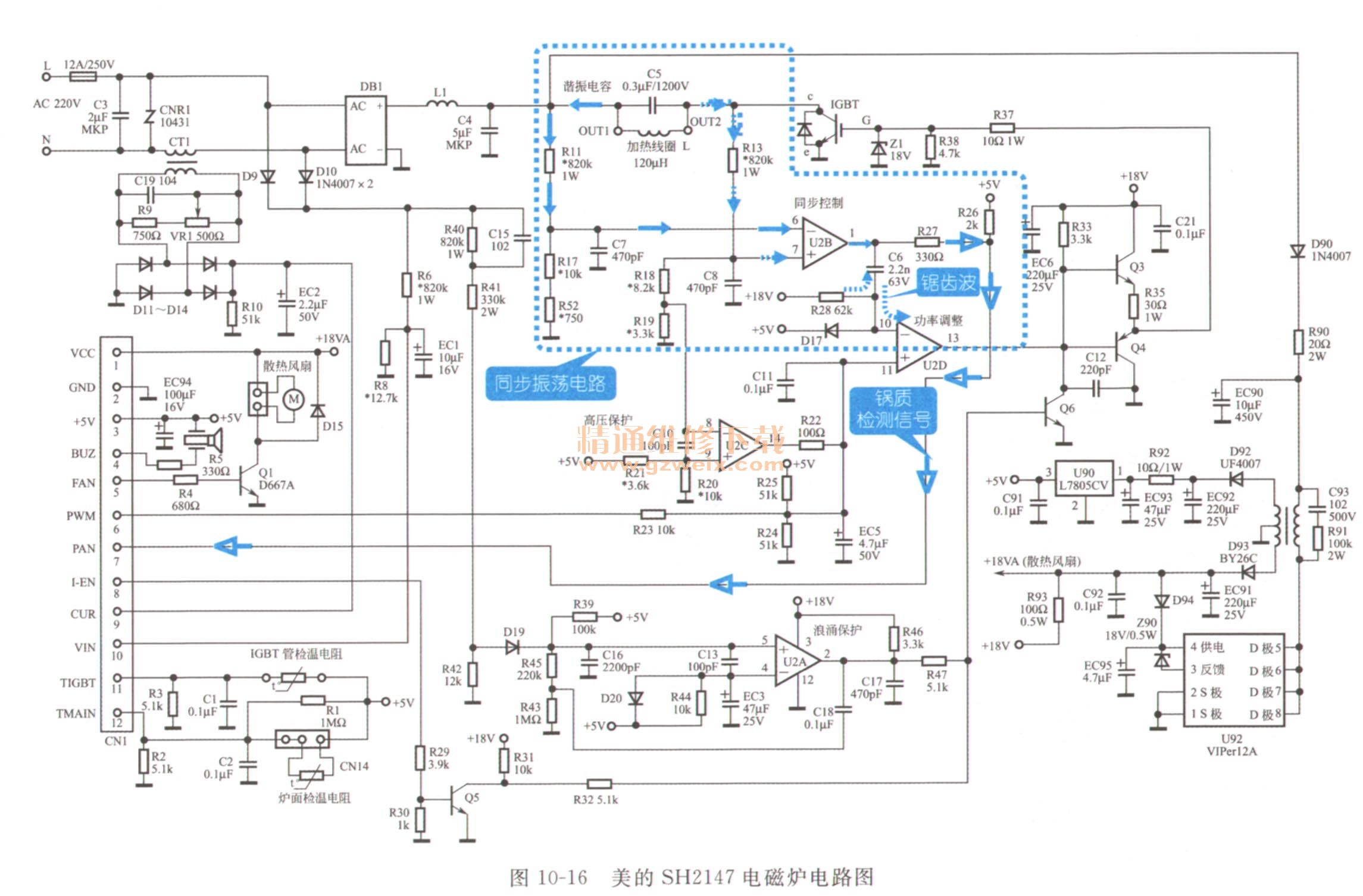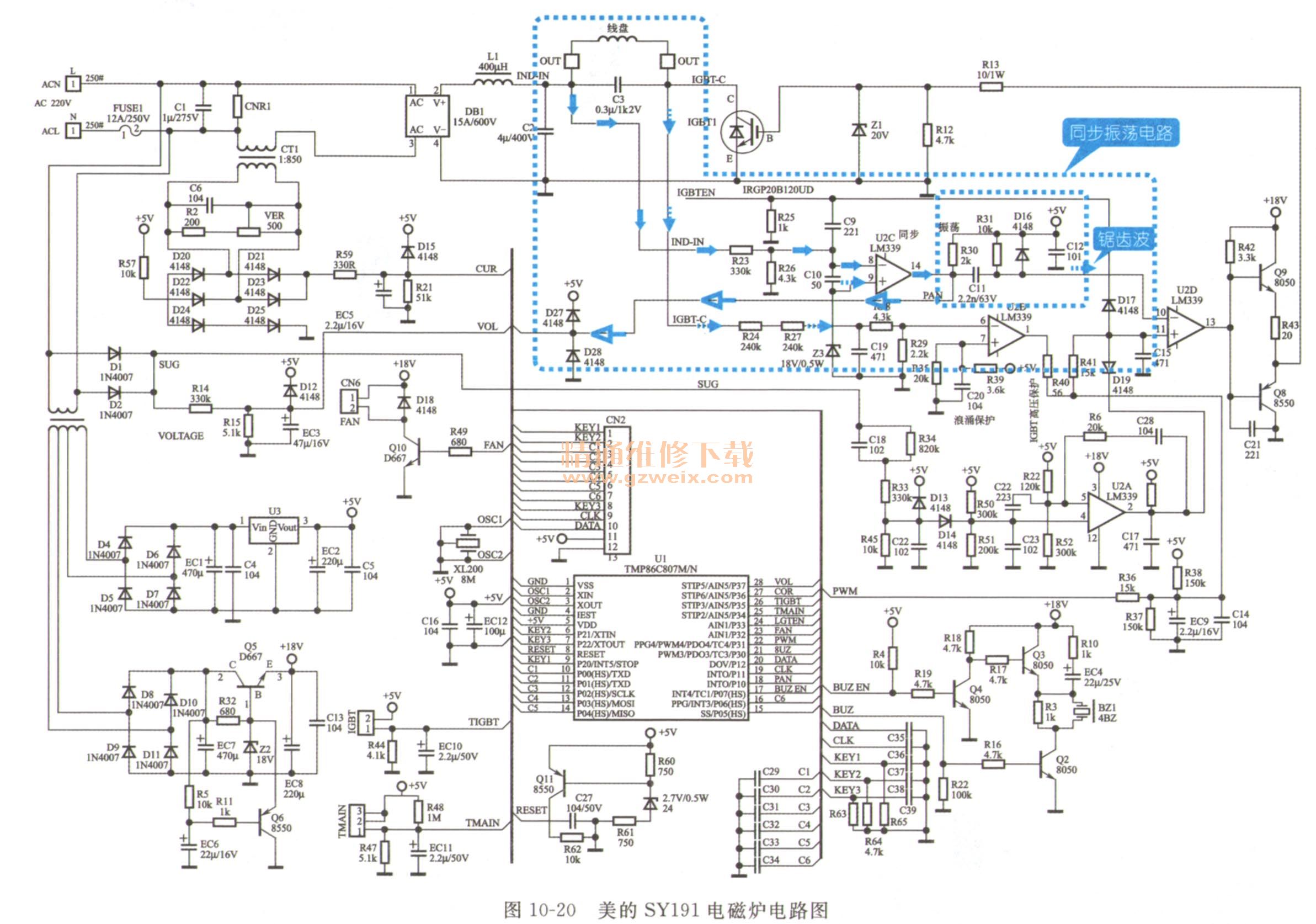電磁爐其他功能基本正常,就是不能實現(xiàn)加熱,懷疑是同步振蕩電路故障,如圖10-20所示為美的SY191電磁爐電路圖。