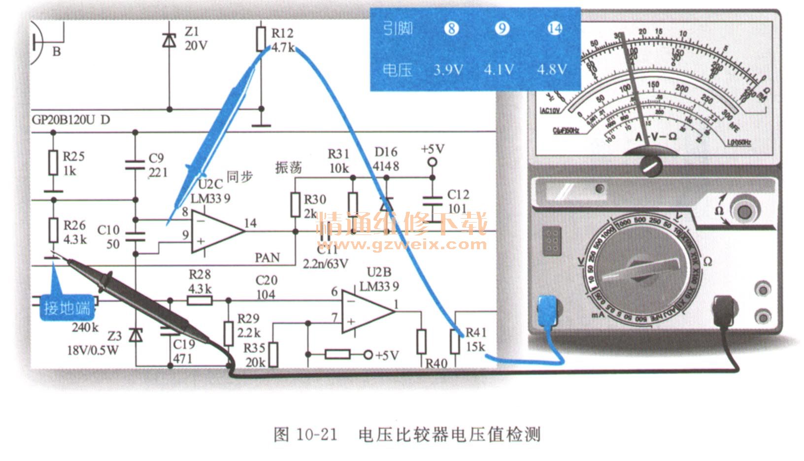 (1)同步振蕩電路由電壓比較器對爐盤線圈兩端的諧振頻率產(chǎn)生的電壓進行比較,如圖10-21所示,經(jīng)檢測,輸入端和輸出端電壓值正常。