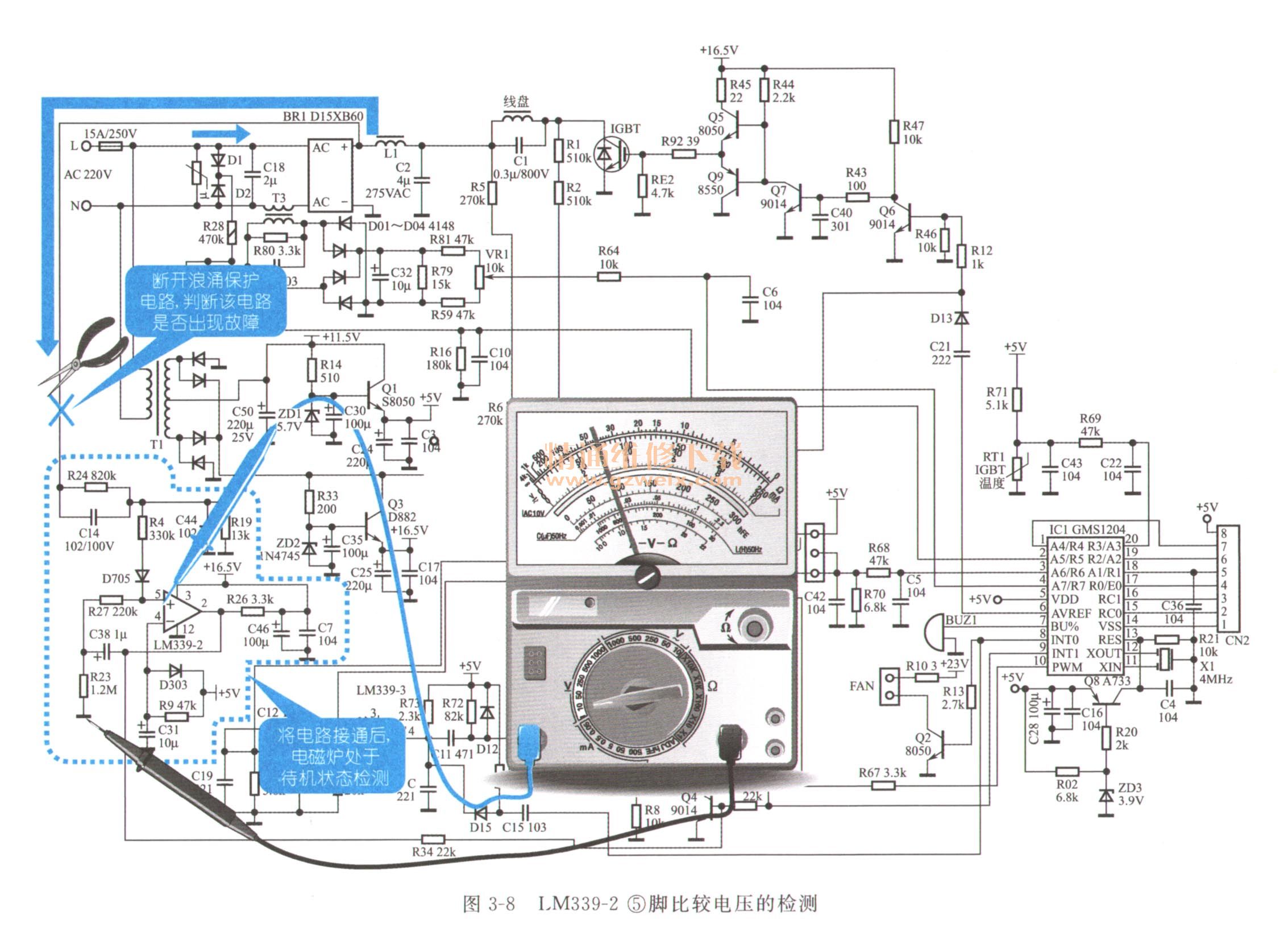 (1)首先使用偏口鉗或刻刀將樂邦LB-19D電磁爐浪涌保護(hù)電路與主電路斷開,斷開后再將電磁爐通電,電磁爐可以正常工作,說明浪涌保護(hù)電路出現(xiàn)故障,此時將浪涌保護(hù)電路接通,將電磁爐處于待機(jī)狀態(tài)下,使用萬用表的直流擋檢測LM339-2的⑤腳的比較電壓是否正常,正常情況下,可檢測到3V的電壓,如圖3-8所示。