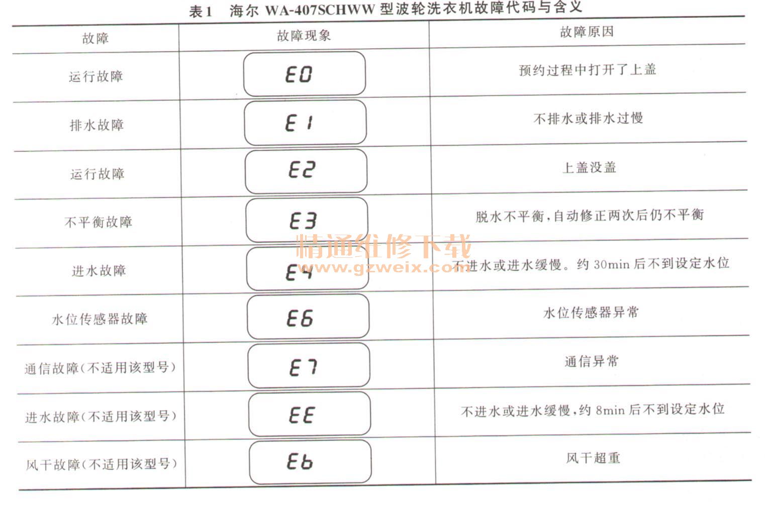 下面以海爾WA-407SCHWW型波輪洗衣機為例介紹電腦控制型波輪洗衣機故障代碼。該機具有故障自動檢測和報警功能,所以出現(xiàn)故障被微處理器識別后,微處理器控制整機停止工作或不能工作,并利用顯示屏顯示E0~E4、E6、E7、EE、Eb的故障代碼,提示該機的故障原因或故障部位,如表1所示。