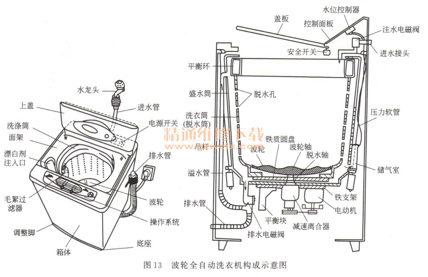 典型的波輪全自動洗衣機由盛水筒、洗衣筒(脫水筒)、波輪、吊桿、水位開關、注水(進水)電磁閥、排水電磁閥(排水泵)、電動機、減速離合器、箱體、箱蓋及控制系統(tǒng)等組成,如圖13所示。