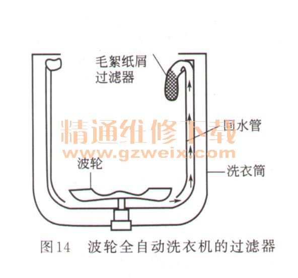 在洗滌筒內壁上嵌有扁形回水管,回水管的下端為進水口,置于洗滌筒的底部,上端接毛絮過濾器。波輪底部的葉片和洗滌筒底部的擋圈構成一個離心泵。洗滌或漂洗時,波輪旋轉,筒內的水被該離心泵抽到進水口內,通過回水管注入毛絮過濾網,使洗滌水中的毛絮、紙屑等雜物被收集在毛絮過濾網內,而不粘到衣物上,實現(xiàn)過濾清潔的目的。