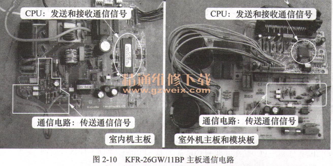 完整的通信電路由室內(nèi)機(jī)主板CPU、室內(nèi)機(jī)通信電路、室內(nèi)外機(jī)連接線、室外機(jī)主板CPU、室外機(jī)通信電路組成。