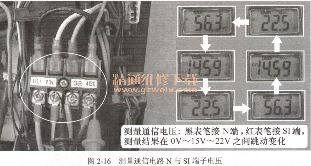根據(jù)以上結(jié)果得出的結(jié)論是:測(cè)量通信回路電壓即N與Si端子,理論的通信電壓變化范圍為0V~15V~24V,但是實(shí)際測(cè)量時(shí),由于光耦次級(jí)光電三極管導(dǎo)通與截止的轉(zhuǎn)換頻率非常快,萬(wàn)用表顯示值通常在0~22V之間變化,如圖2-16所示。