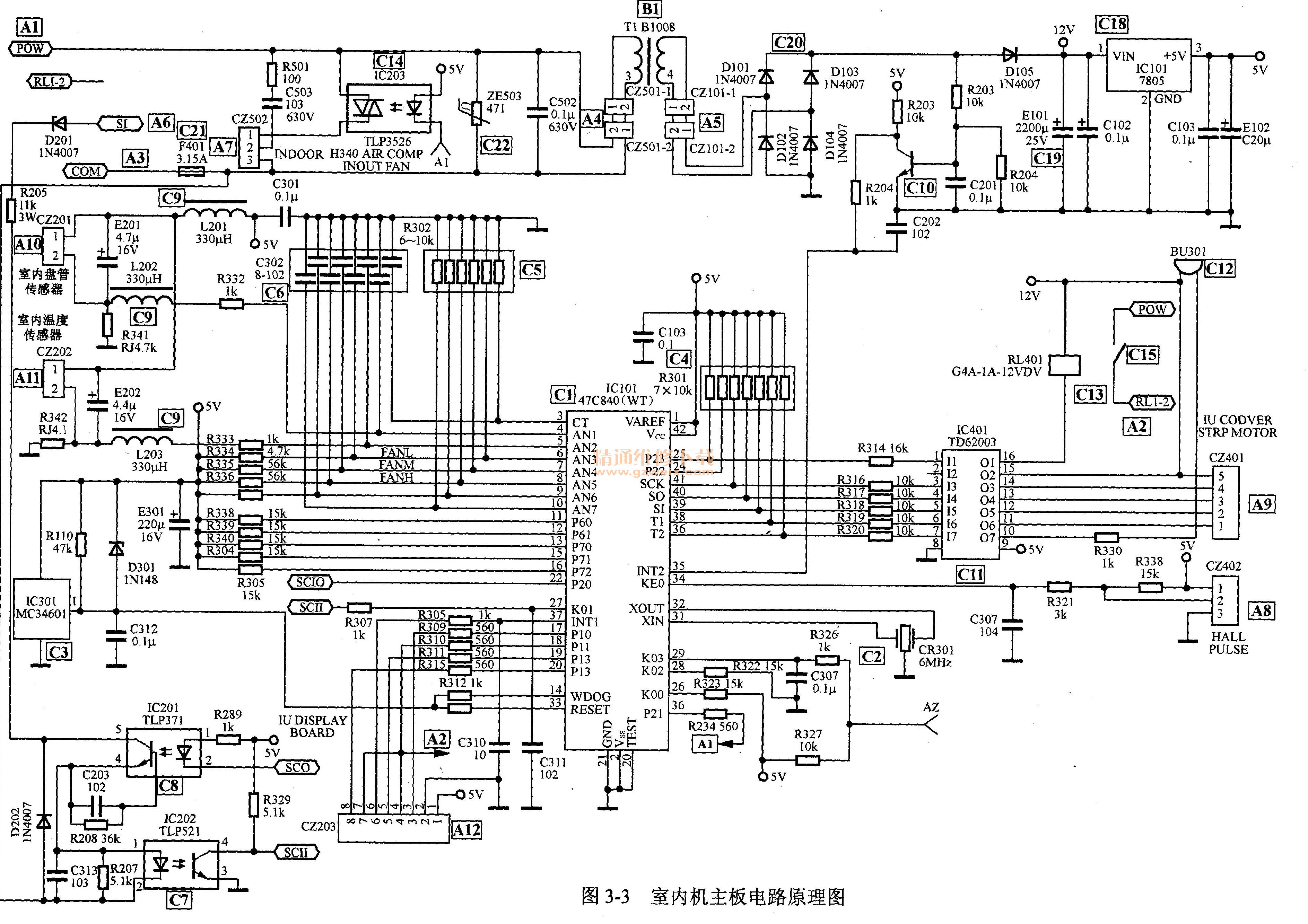 圖3-2所示為室內(nèi)機電控系統(tǒng)方框圖,圖3-3所示為室內(nèi)機主板電路原理圖,插座及外 圍元器件如圖3-4所示,主板電子元器件如圖3-5所示。