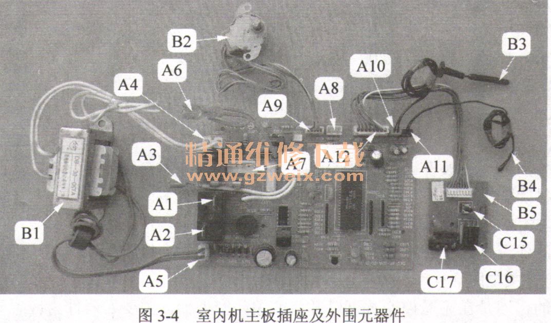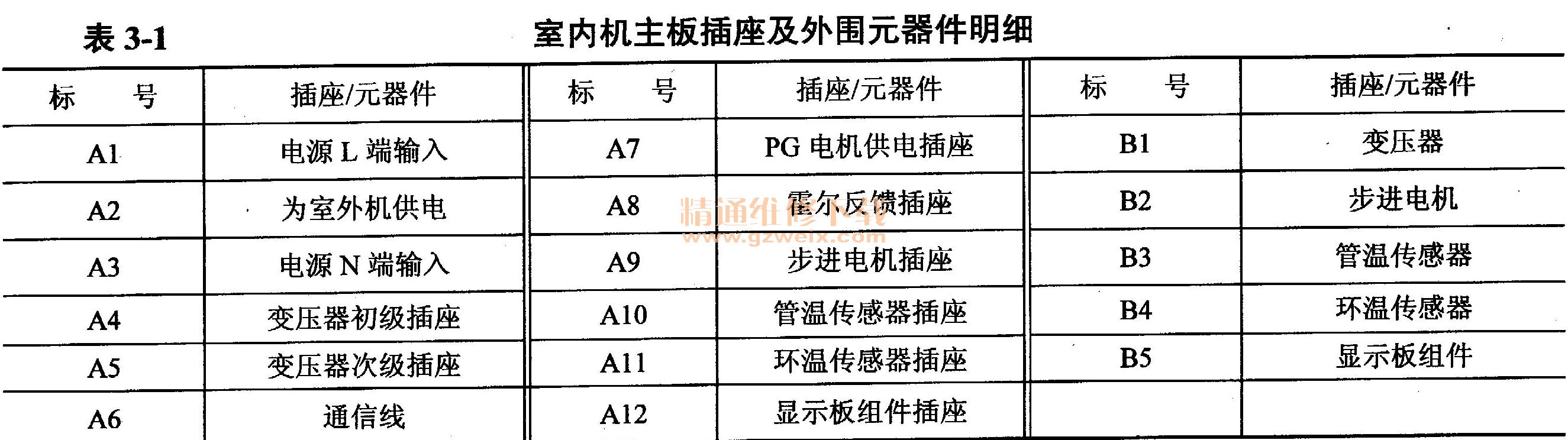 表3-1所示為室內(nèi)機主板插座及外圍元器件明細,圖3-4所示為實物外觀。