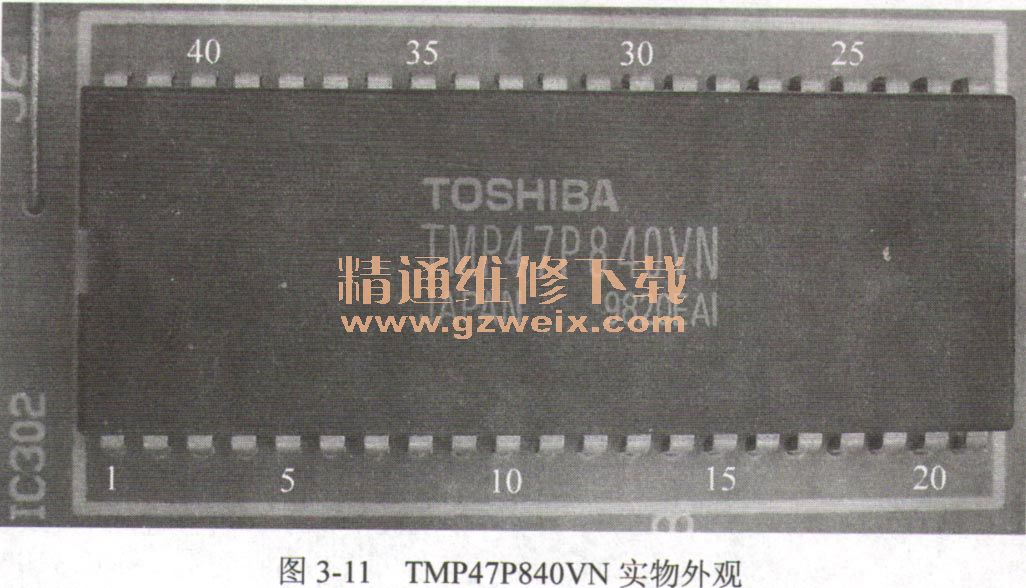 CPU是主板上體積最大、引腳最多的器件。現(xiàn)在主板CPU的引腳功能都是空調(diào)器廠家結(jié)合軟件來確定的,也就是說同一型號的CPU在不同空調(diào)器廠家主板上引腳的作用是不一樣的。海信KFR-2601 GWBP室內(nèi)機CPU型號為東芝TMP47P840VN,主板代號IC302,共有42個引腳,圖3-11所示為其實物外觀,表3-9為主要引腳功能。