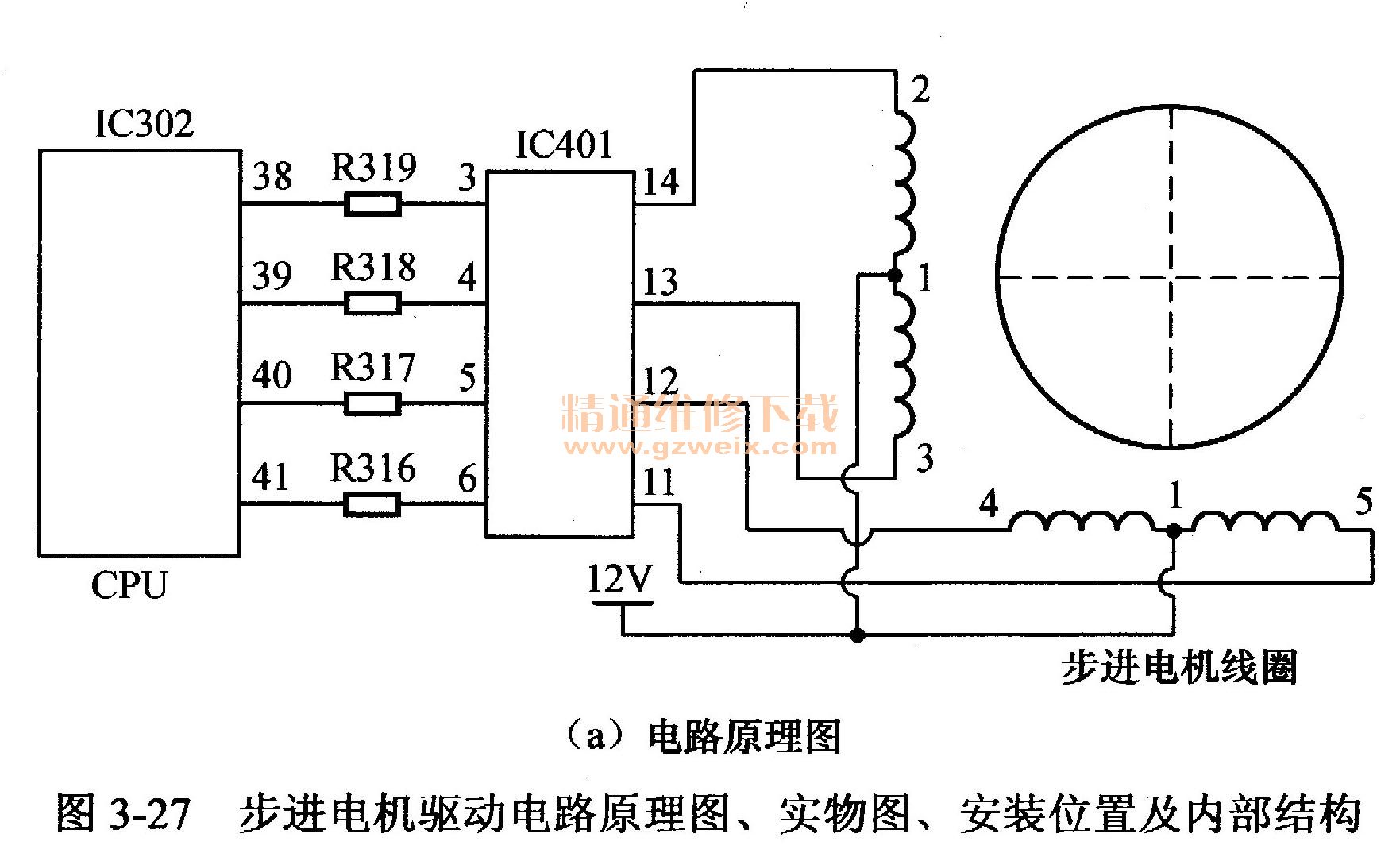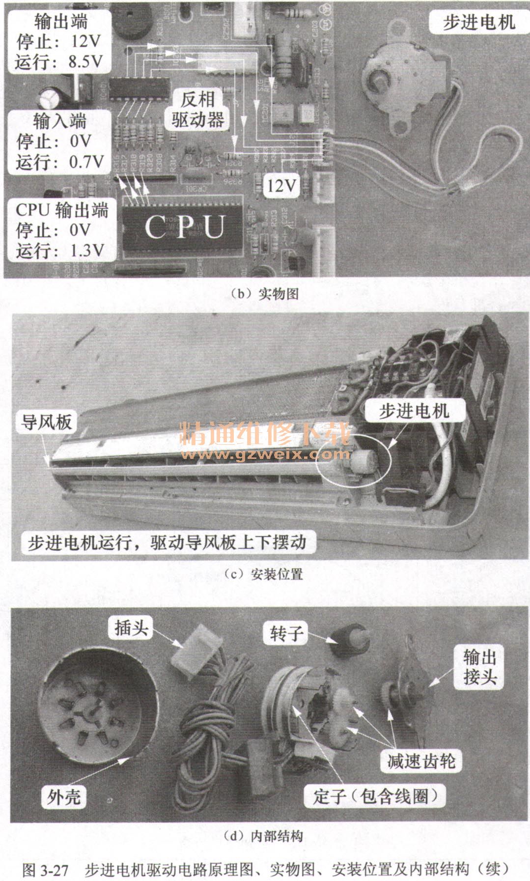 圖3-27(a)所示為KFR-2601 GWBP步進電機驅(qū)動電路原理圖,圖3-27(b)所示為實物圖,圖3-27(c)所示為安裝位置,圖3-27(d)所示為內(nèi)部結(jié)構(gòu),表3-20為CPU引腳電壓與步進電機狀態(tài)對應(yīng)關(guān)系。