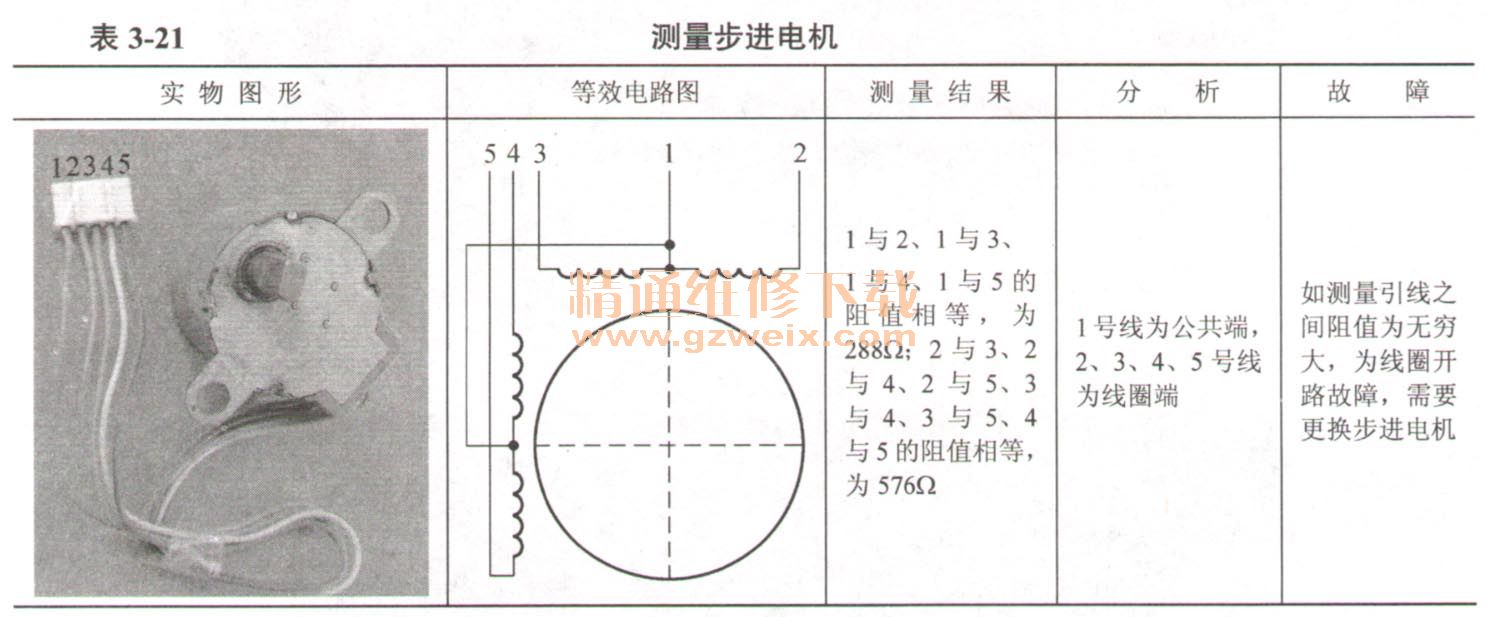 英文“FLAP”是步進電機在主板上的插座代號,線圈工作電壓為直流12V。使用萬用表電阻擋測量5根引線之間的阻值,結(jié)果見表3-21。