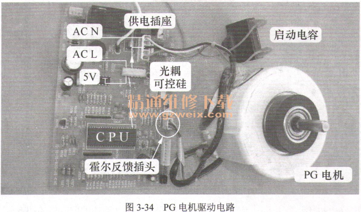 PG電機(jī)內(nèi)部設(shè)有霍爾元件,旋轉(zhuǎn)時輸出端輸出霍爾信號,通過CZ402插座、電阻R321提供給CPU②腳,CPU內(nèi)部電路計算出實際轉(zhuǎn)速,與目標(biāo)轉(zhuǎn)速相比較,如有誤差通過改變光耦可控硅導(dǎo)通角,從而改變PG電機(jī)工作電壓,使實際轉(zhuǎn)速與目標(biāo)轉(zhuǎn)速相同。
