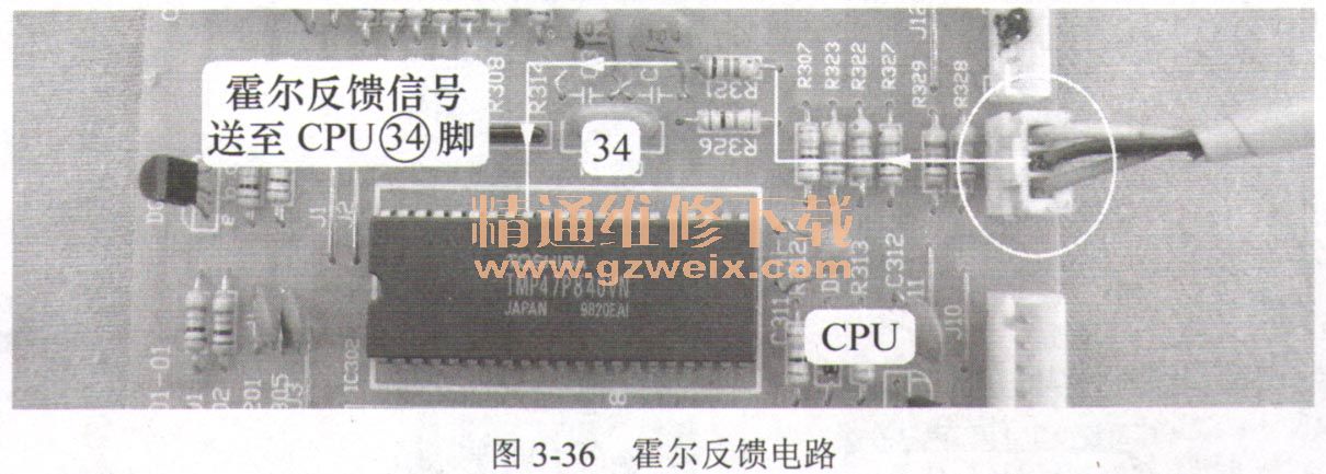 霍爾反饋電路的作用是向CPU提供代表PG電機(jī)實際轉(zhuǎn)速的霍爾信號,由PG電機(jī)內(nèi)部霍爾反饋元件、電阻R328/R321、電容C306、CPU的34腳組成。