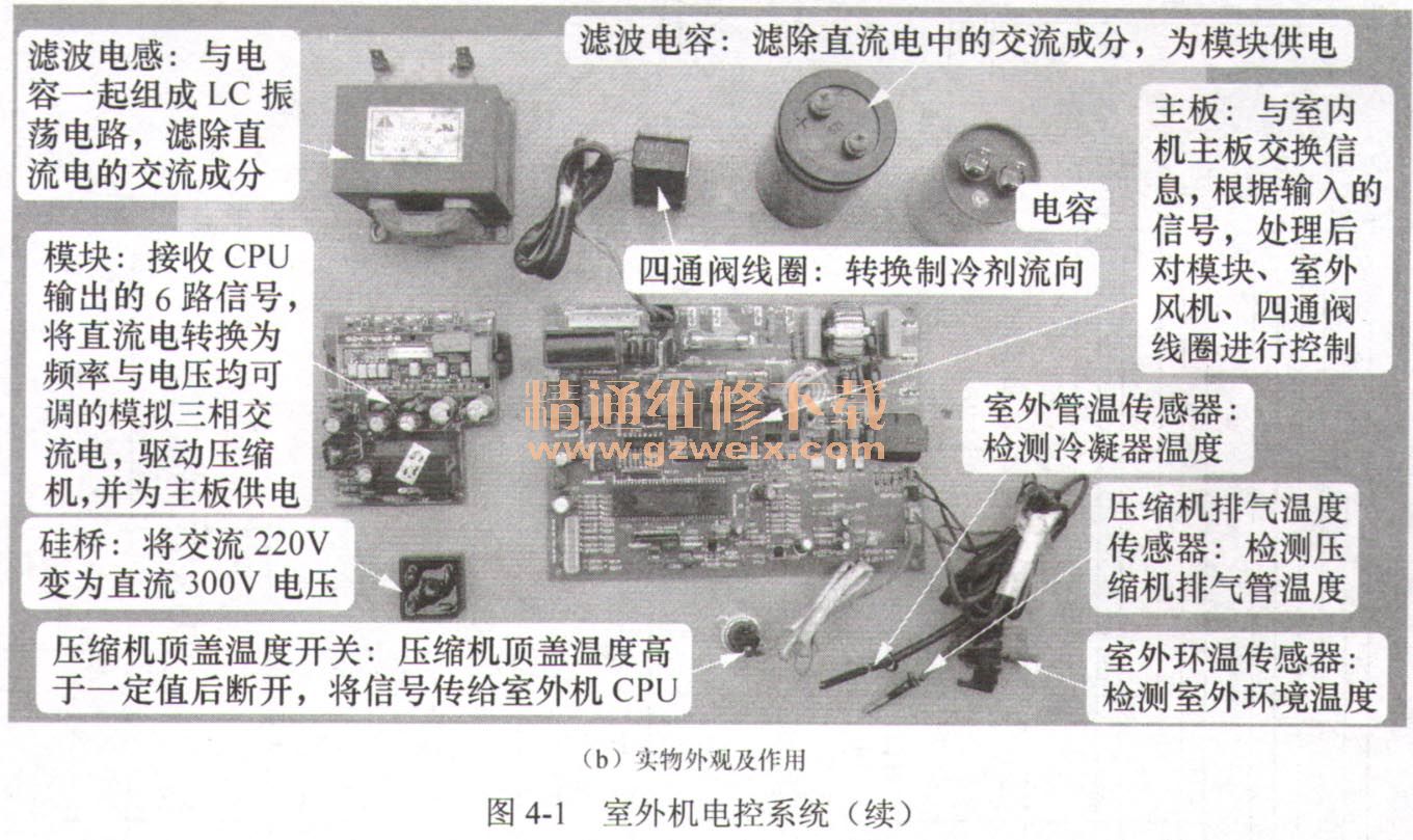 圖4-1(a)所示為室外機電氣接線圖,圖4-1(b)所示為實物外觀及作用(不含壓縮機、室外風(fēng)扇電機、端子排)。從圖上可以看出,室外機電控系統(tǒng)由主板(室外機控制板)、硅橋、4濾波電感、電容、濾波電容(電解電容)、模塊(功率模塊組件)、壓縮機、壓縮機頂蓋溫度開關(guān)(壓縮機過熱保護器)、風(fēng)扇電機、四通閥線圈、室外環(huán)溫傳感器(外環(huán)溫度)、室外管溫傳感器(熱交溫度)、壓縮機排氣溫度傳感器(壓縮機排氣溫度)、端子排組成。