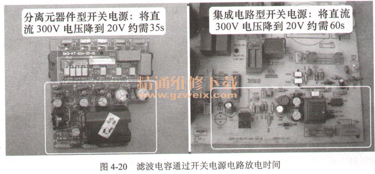分離元器件型開關(guān)電源電路,濾波電容容量為2 500μF,從直流300V下降到直流70V左右(此時(shí)開關(guān)電源不再工作)需要25s,下降到直流20V需要35s,下降到5V需要95s;集成電路型開關(guān)電源電路,濾波電容容量為1 500μF,從直流300V下降到直流57V左右(此時(shí)開關(guān)電源不再工作)需要45s,下降到20V需要60s 。