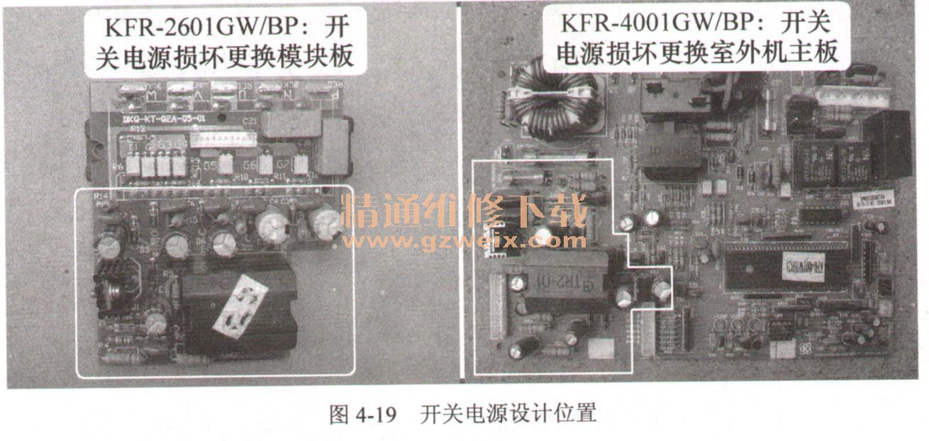例如海信變頻空調(diào)器,工作原理及元器件型號(hào)相同的開關(guān)電源電路,假設(shè)開關(guān)管2SC3150損壞,因無配件需要更換電路板時(shí),KFR-2601 GWBP更換的是模塊板,KFR-4001 GWBP更換的是室外機(jī)主板,如圖4-19所示。