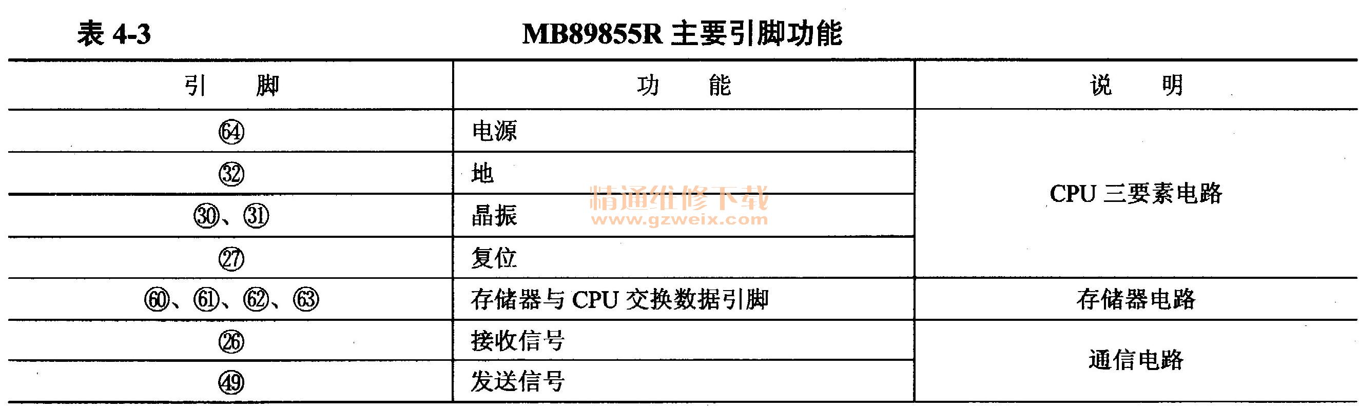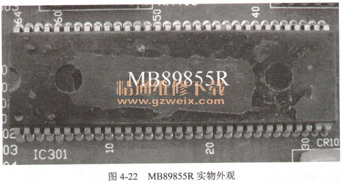 CPU是主板上體積最大、引腳最多的元器件。現(xiàn)在主板CPU的引腳功能都是空調(diào)器廠家結(jié)合軟件來確定的,也就是說同一型號的CPU在不同空調(diào)器廠家主板上引腳的作用是不一樣的。海信空調(diào)器KFR-2601 GWBP室外機(jī)CPU型號為MB89855R,主板代號IC301,共有64個引腳,圖4-22所示為其實物外觀,表4-3為該CPU的主要引腳功能。