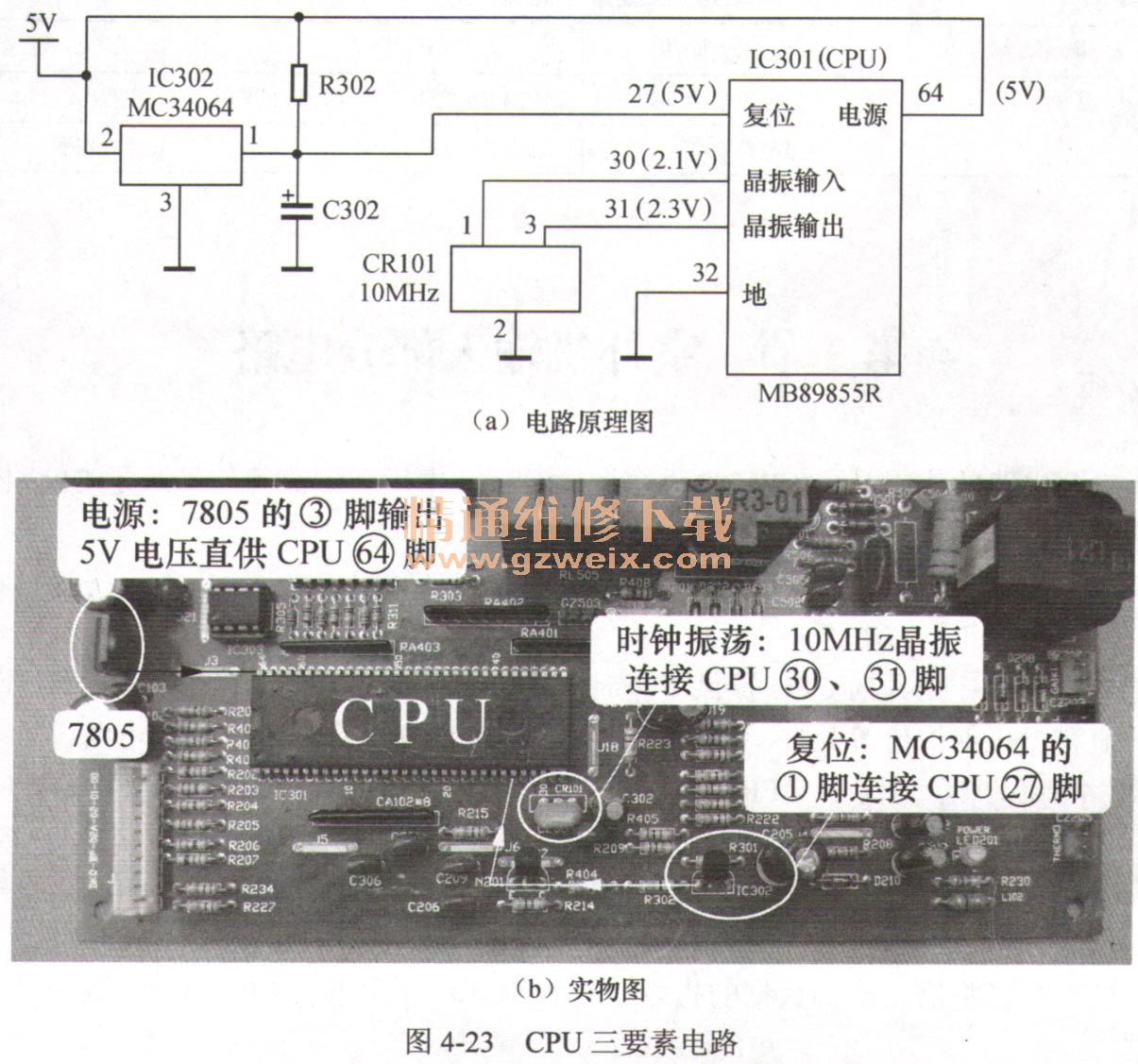 圖4-23(a)所示為海信KFR-2601 GWBP的CPU三要素電路原理圖,圖4-23(b)所示為實物圖。