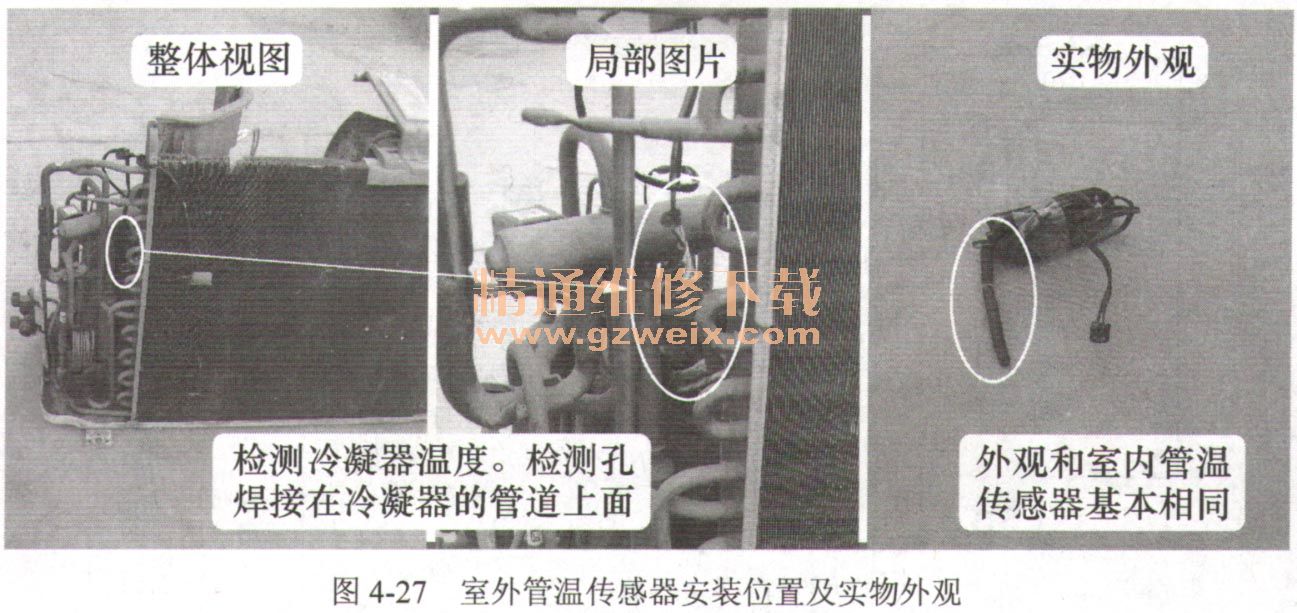 圖4-27所示為室外管溫傳感器安裝位置及實(shí)物外觀。