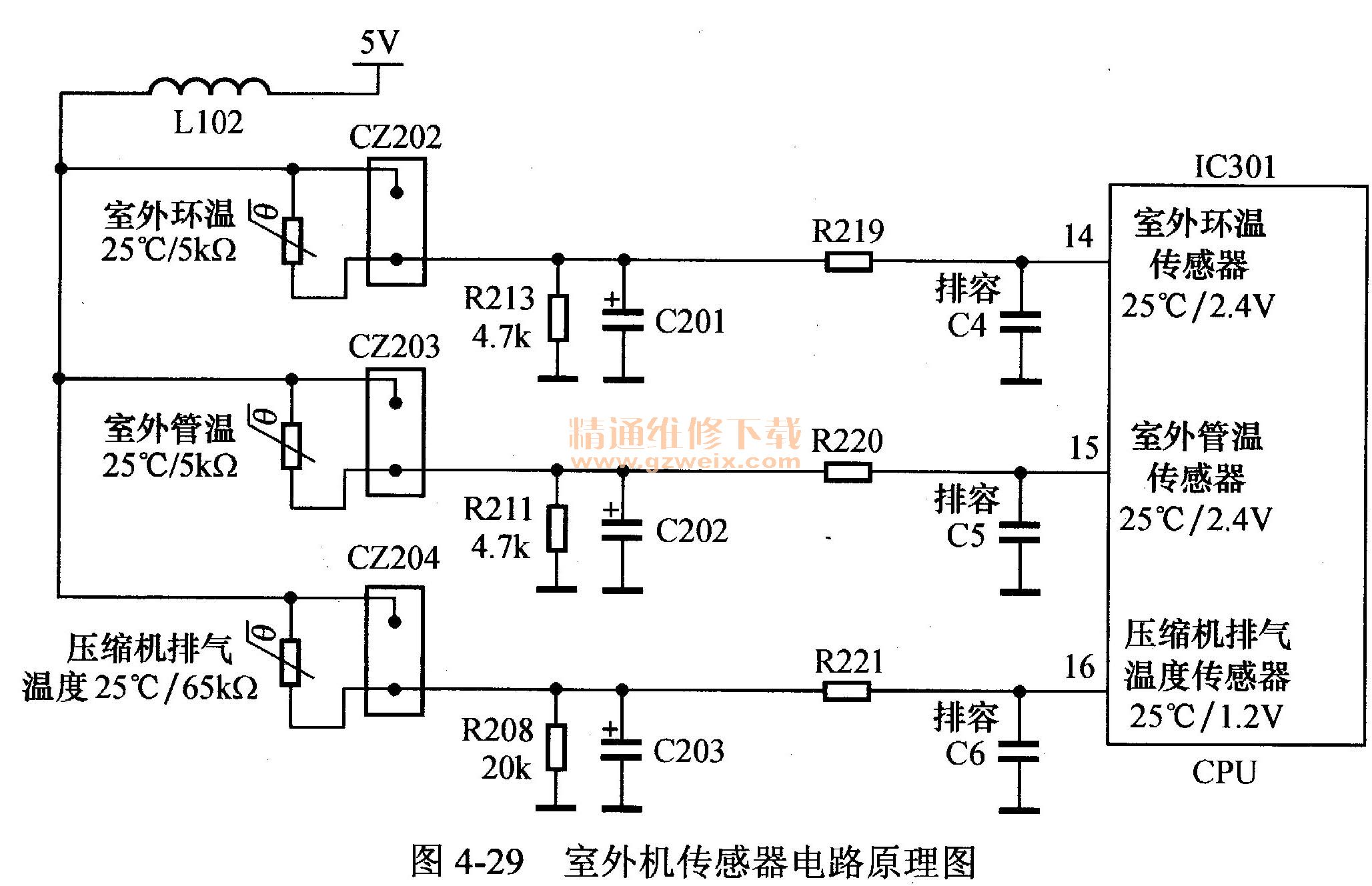 傳感器電路向室外機(jī)CPU提供室外環(huán)境溫度、室外冷凝器溫度和壓縮機(jī)排氣管溫度3種溫度信號(hào)。