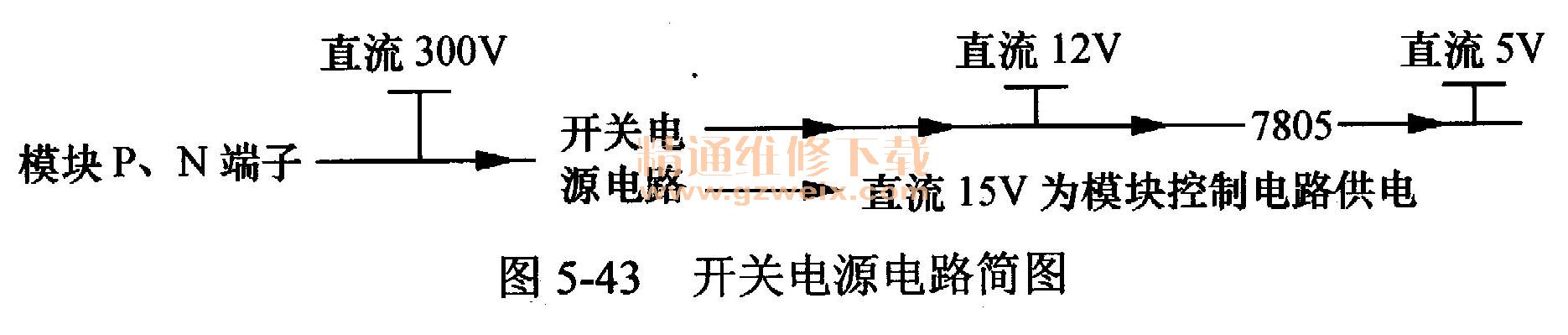 本機(jī)使用開(kāi)關(guān)電源型電源電路,開(kāi)關(guān)電源電路也可稱(chēng)為電壓轉(zhuǎn)換電路,就是將輸入的直流300V電壓轉(zhuǎn)換為直流12V和5V為主板CPU等負(fù)載供電,以及轉(zhuǎn)換為直流15V電壓為模塊內(nèi)部控制電路供電。圖5-43所示為開(kāi)關(guān)電源電路簡(jiǎn)圖。