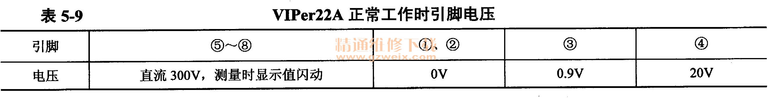 使用萬(wàn)用表直流電壓擋,黑表筆接直流300V電壓地,紅表筆接引腳,開(kāi)關(guān)電源電路正常工作時(shí)VIPer22A實(shí)測(cè)結(jié)果見(jiàn)表5-9。