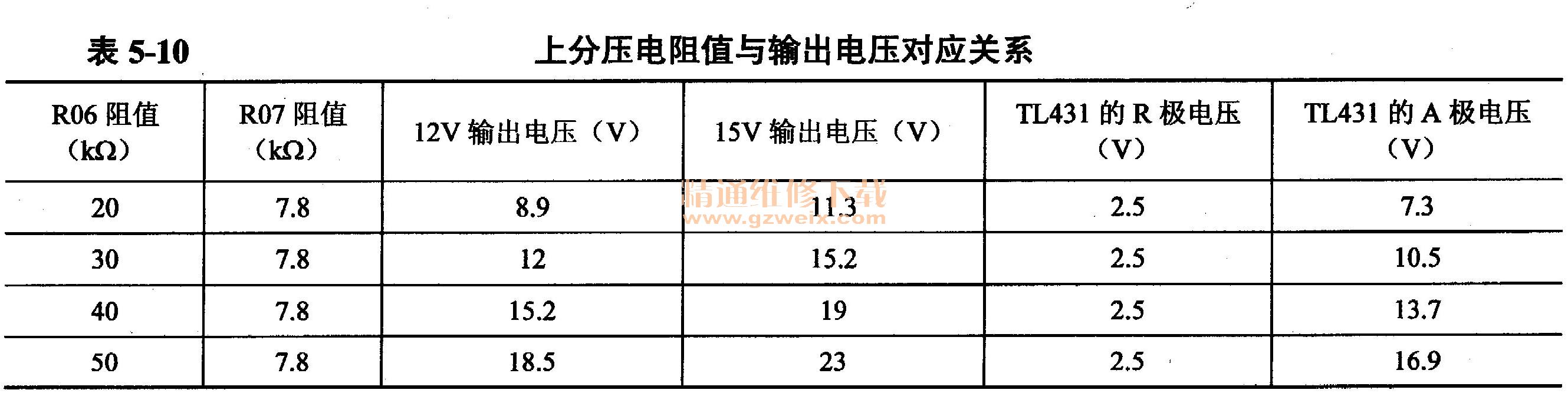 輸出電壓計(jì)算公式Uo=2.5×(1+上分壓電阻阻值/下分壓電阻阻值)。本機(jī)主板上分壓電阻代號(hào)為R06( 3 0kΩ),下分壓電阻代號(hào)為R07(7.8kΩ),改變R06阻值即可改變直流12V的輸出電壓,相應(yīng)直流15V電壓也成比例地改變,阻值及輸出電壓對(duì)應(yīng)關(guān)系見(jiàn)表5-10。
