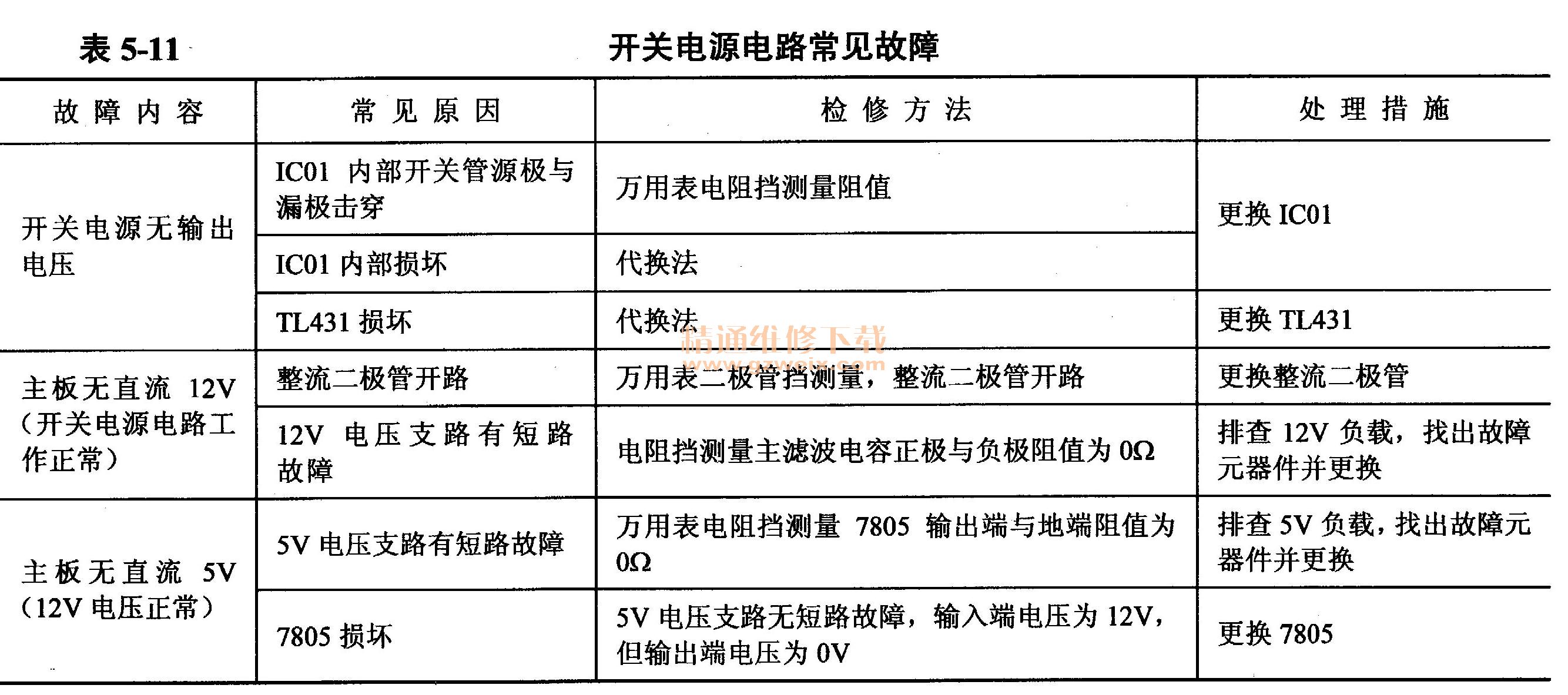 開(kāi)關(guān)電源電路故障率最高,常見(jiàn)故障見(jiàn)表5-11。