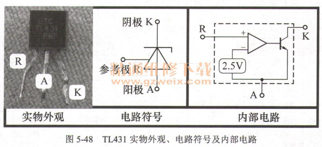 圖5-48所示為T(mén)L431的實(shí)物外觀、電路符號(hào)及內(nèi)部電路。