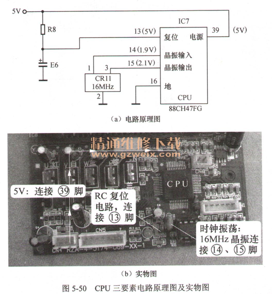 圖5-50(a)所示為CPU三要素電路原理圖,圖5-50(b)所示為實物圖。