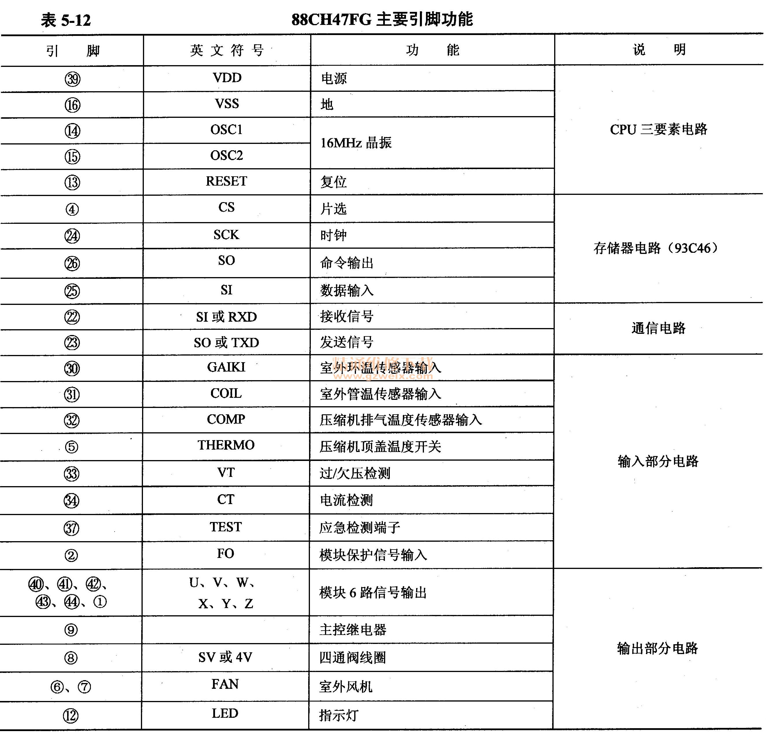 海信KFR-26GW/11BP室外機CPU型號為88CH47FG,主板代號IC7,共有44個引腳在四面引出,采用貼片封裝。圖5-49所示為88CH47FG的實物外觀,表5-12為其主要引腳功能。