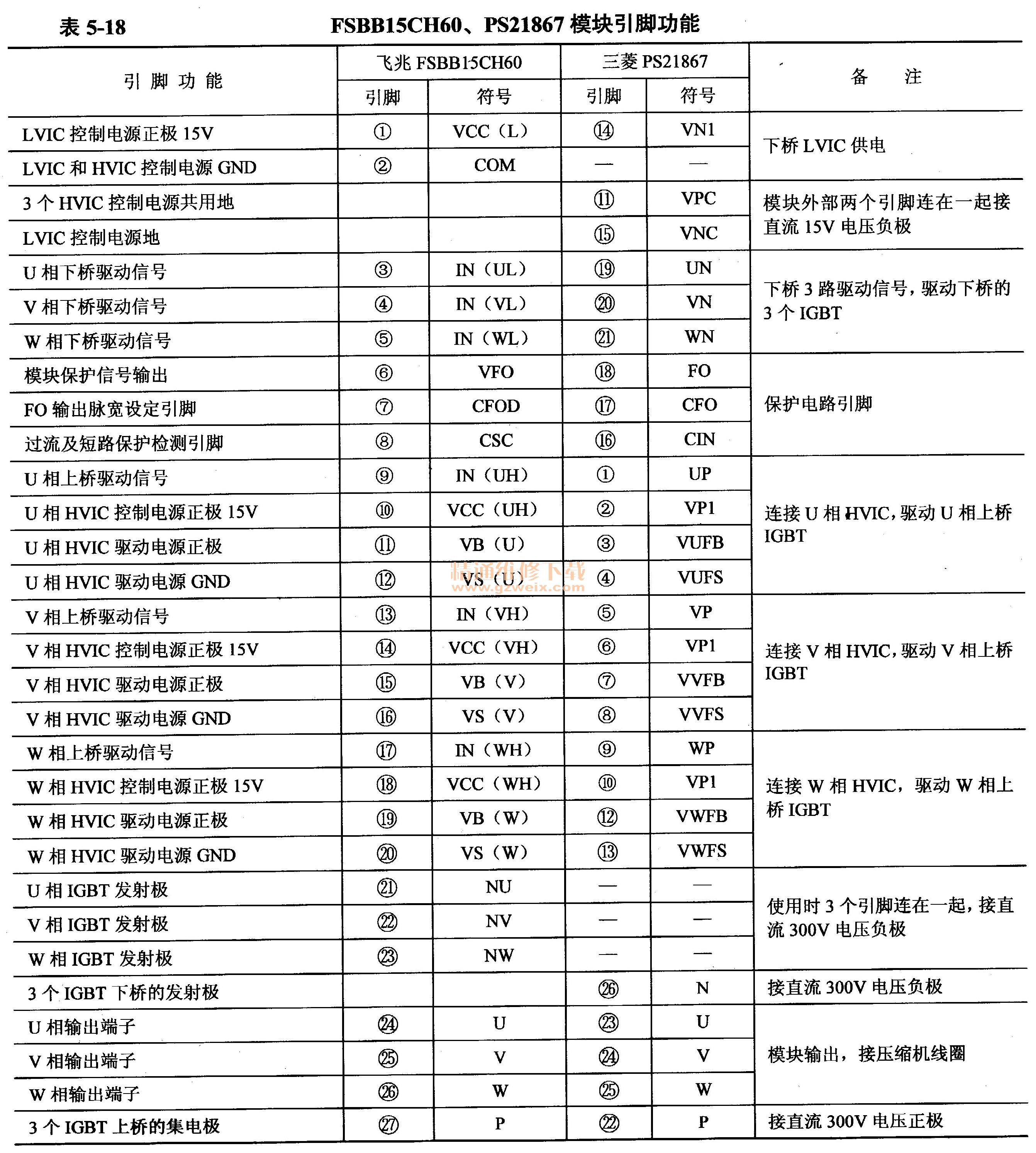 飛兆FSBB 15CH60模塊和三菱第三代PS21867模塊的引腳功能基本一樣,只是排列順序不同,引腳功能見表5-18。