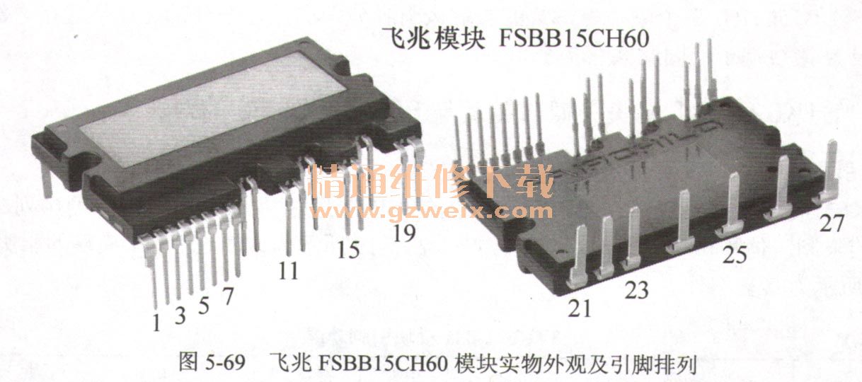 圖5-69所示為飛兆FSBB 15CH60模塊實物外觀及引腳排列;圖5-70所為三菱第三代模塊,左側(cè)為大型封裝PS21867模塊,右側(cè)為小型封裝PS21564模塊。