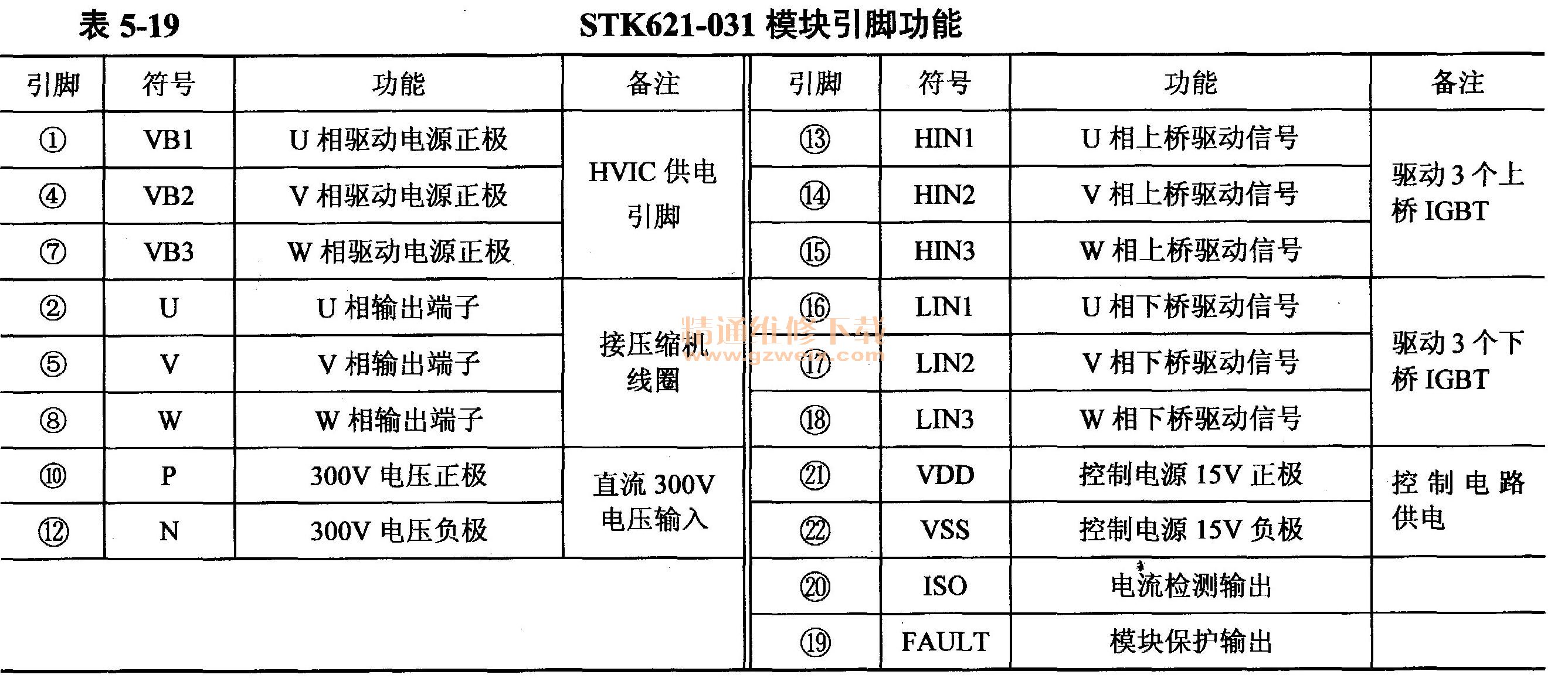 STK621-031是最早應用在變頻空調(diào)器中的單電源模塊,引腳較少且在一側(cè)排列,由于早期技術的限制,體積相對較大,目前己停產(chǎn)。表5-19所示為STK621-031模塊的引腳功能,圖5-71所示為其實物外觀。