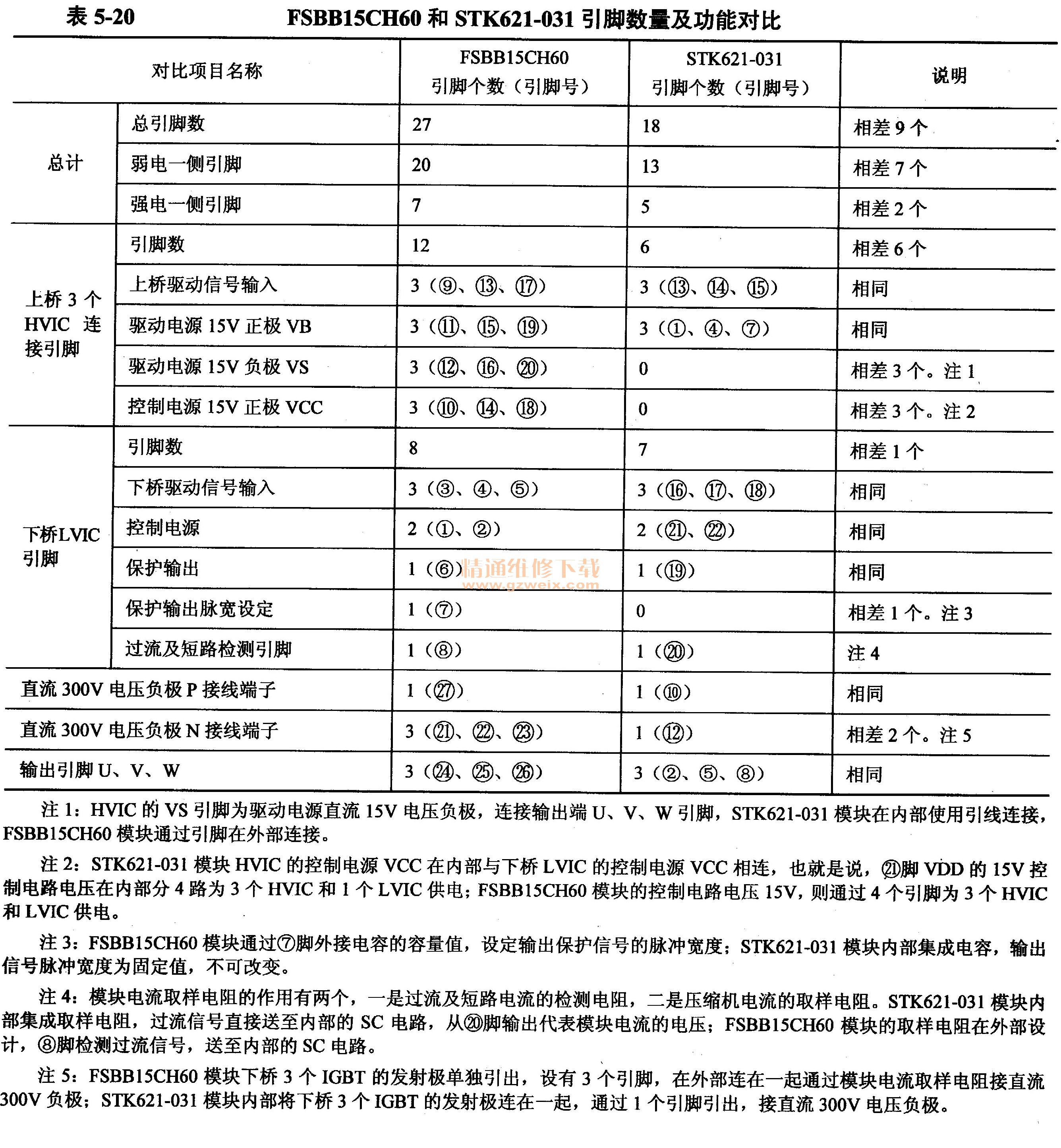 STK621-031之所以以較少的引腳起到與FSBB 15CH60相同的作用,原因就是部分引線集成在模塊內(nèi)部,并沒有使用引腳。表5-20所示為FSBB 15CH60和STK621-031引腳數(shù)量及功能對比。