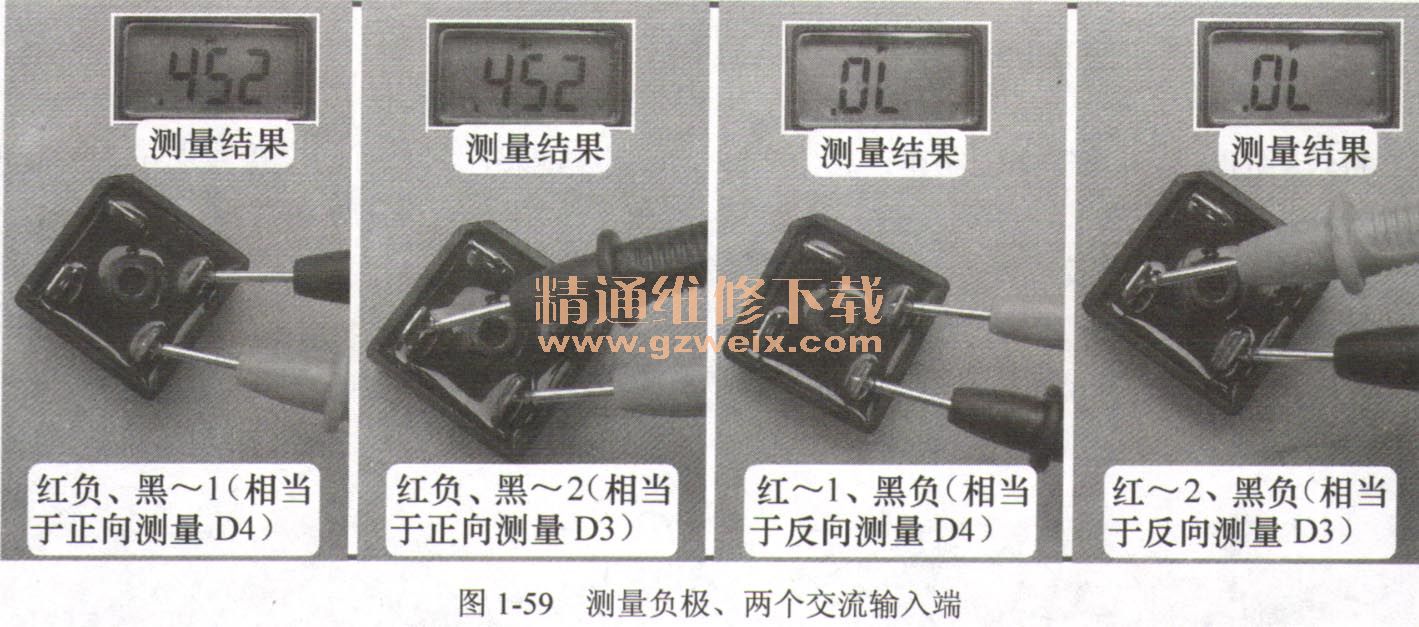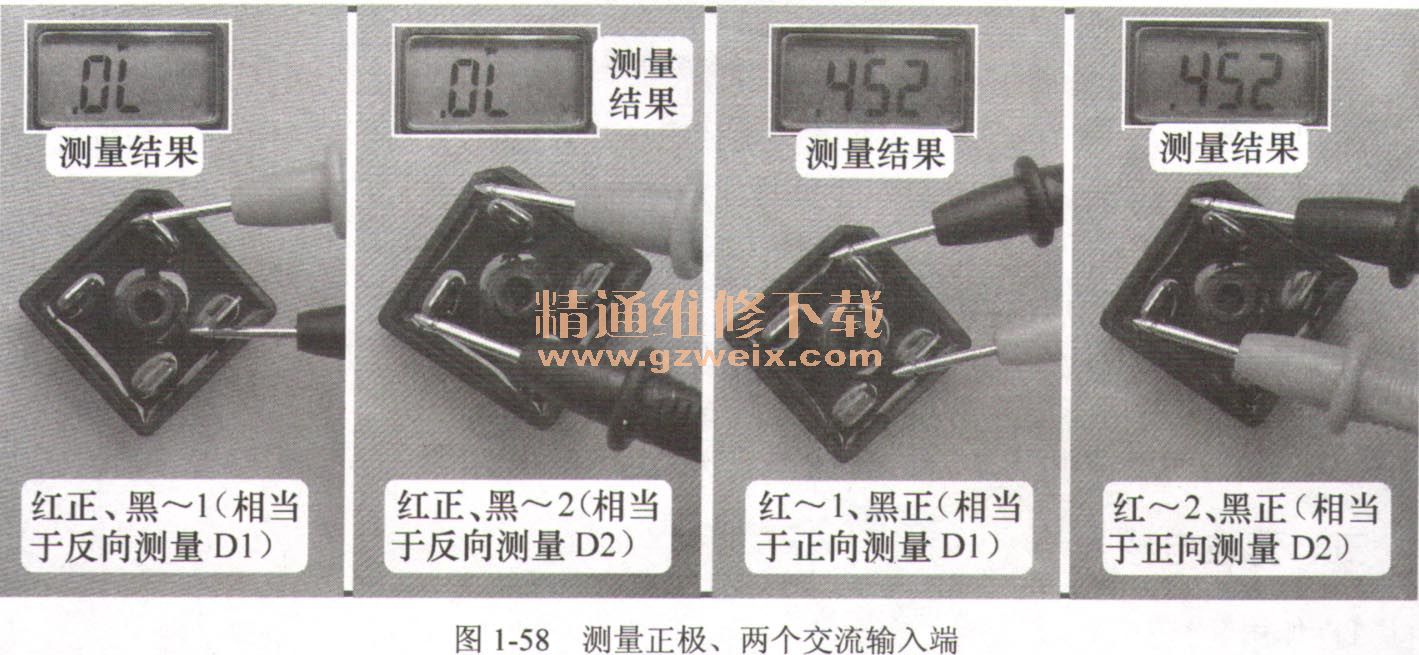 ③不同的硅橋、不同的萬用表正向測量時,得出結(jié)果的數(shù)值會不相同,但一定要符合內(nèi)部4個整流二極管連接特點所構(gòu)成的規(guī)律。