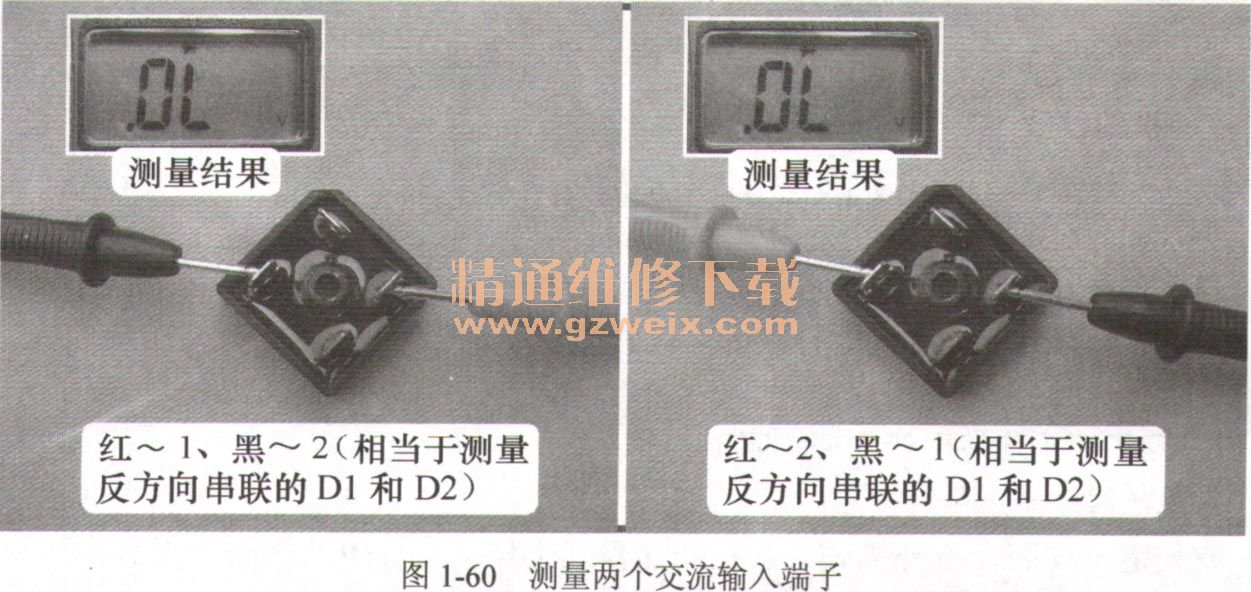 測量過程如圖1-60所示,相當于測量反方向串聯(lián)的D1和D2(或D3和D4),由于為反向串聯(lián),因此正反向測量結(jié)果應均為無窮大。