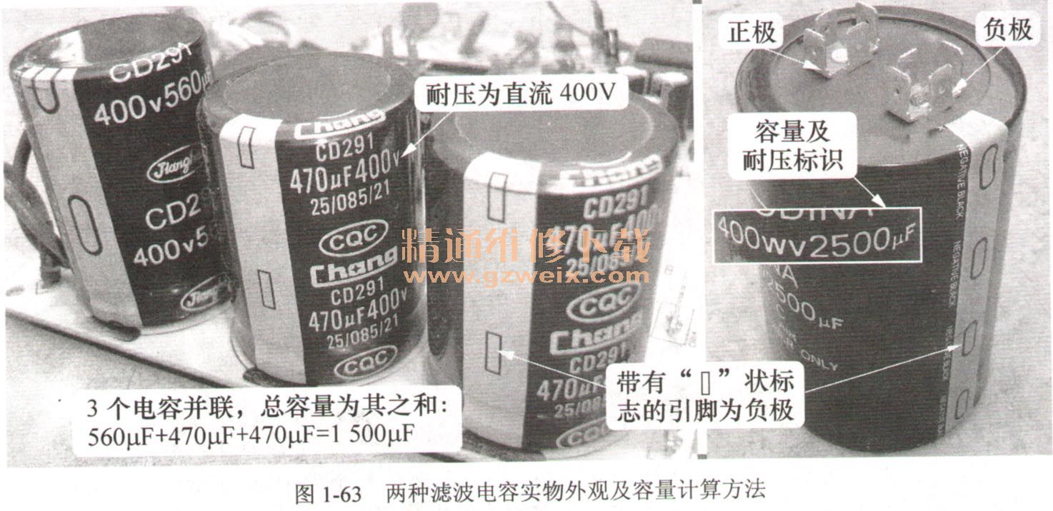 濾波電容按電容個數(shù)分類,有兩種類型:單個電容或幾個電容并聯(lián)組成,實物外觀如圖1-63所示。
