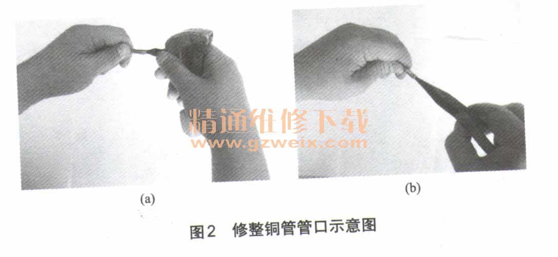 采用小型割管刀切割制冷系統(tǒng)的銅管時(shí),應(yīng)先把需要切割的部位弄直,并將它的表面處理干凈后,再旋轉(zhuǎn)切管刀的手柄使管口夾住銅管的切割部位。隨后,順時(shí)針均勻平緩地旋轉(zhuǎn)割管刀至1~2圈后,再適當(dāng)旋緊管刀手柄,以保證管刀夾緊銅管,當(dāng)?shù)度星腥算~管管壁的3/4時(shí)停止,撤去管刀,冊(cè)斷銅管。