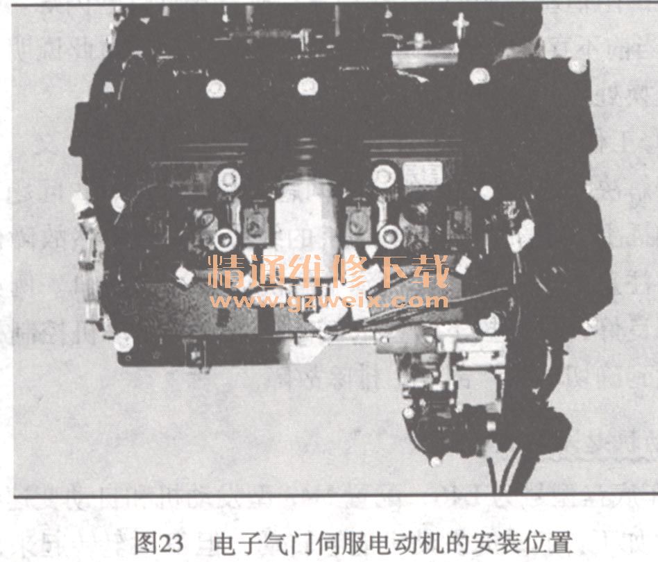 啟動發(fā)動機之后,怠速工況平穩(wěn),但儀表板的黃色EML警告燈(即發(fā)動機故障燈)一直點亮。進行加速試驗,發(fā)動機加速性能很差,即使將加速踏板踩到底,轉速也達不到4500r/mi。以上。連接診斷儀進行自診斷,發(fā)動機系統有兩個故障碼,內容分別為“2A67,電子氣門系統內部故障,對負極短路,故障當前存在”和“2A6B,,電子氣門伺服電動機功率受到限制,偏心軸角度達不到最大升程要求,故障當前不存在”。由于故障碼2A67與電子氣門伺服電動機有直接關系,因此對電子氣門伺服電動機進行檢修。該部件安裝在氣門室罩蓋上(圖5-23),由發(fā)動機控制模塊直接控制。電子氣門伺服電動機控制線路圖見圖5-24。