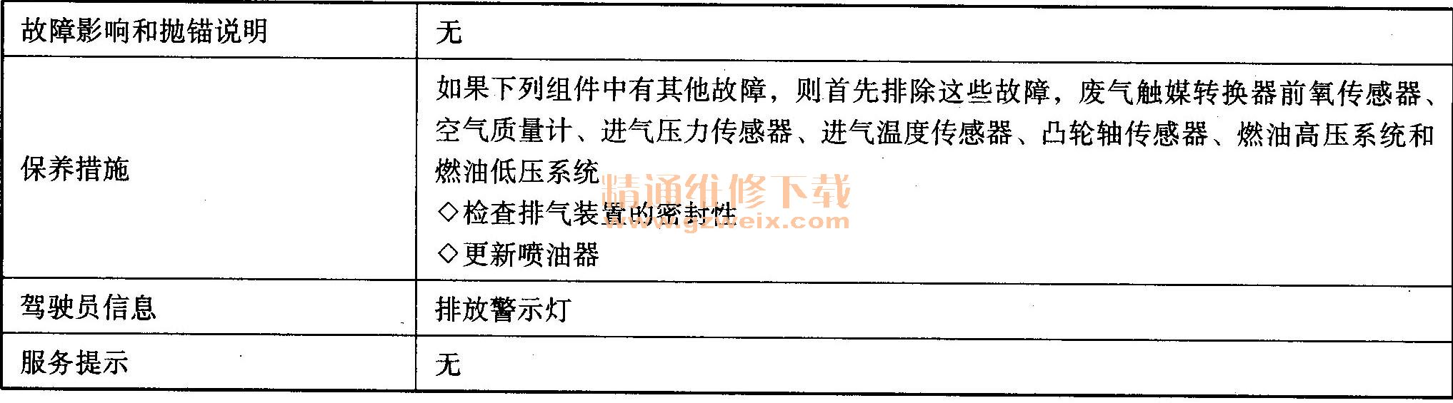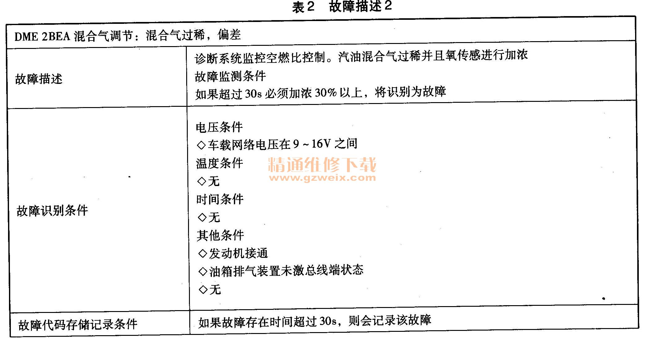 表2中的保養(yǎng)措施有這樣的建議,如果下列組件中有其他故障(廢氣觸媒轉(zhuǎn)換器前氧傳感器、空氣流量計(jì)、進(jìn)氣壓力傳感器、進(jìn)氣溫度傳感器、凸輪軸傳感器、燃油高壓系統(tǒng)和燃油低壓系),則首先排除這些故障。而通過(guò)檢測(cè)儀讀取的故障內(nèi)容剛好有關(guān)于空氣流量傳感器的故障,所以“DME 2BEA混合氣調(diào)節(jié):混合氣過(guò)稀,偏差。”這個(gè)故障內(nèi)容,可以暫時(shí)忽略不計(jì)。