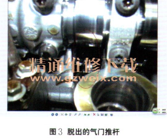 將1、4缸噴油器對(duì)調(diào)后試車(chē),故障依舊。測(cè)量1缸噴油器控制信號(hào)的波形(圖2),與其他缸的一致。既然點(diǎn)火和噴油都沒(méi)有問(wèn)題,接下來(lái)決定測(cè)量缸壓。測(cè)量發(fā)現(xiàn)1缸的缸壓可以達(dá)到10 M Pa,與其他缸的一致。拆卸氣門(mén)室蓋檢查,發(fā)現(xiàn)1缸的一個(gè)進(jìn)氣門(mén)推桿傾斜(圖3)。分析認(rèn)為,出現(xiàn)這種現(xiàn)象的原因是發(fā)動(dòng)機(jī)曾經(jīng)轉(zhuǎn)速過(guò)高,使氣門(mén)未能充分回位,導(dǎo)致推桿從液壓挺桿上脫出。