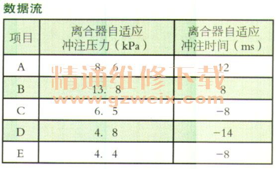 (1)變速器油質(zhì)清澈透明,氣味無異常且無焦瑚味道;查閱診斷數(shù)據(jù)中變速器中各個離合器適應(yīng)值(如表所示),數(shù)據(jù)無異常。