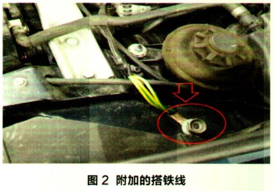 測量發(fā)動機至車身搭鐵的電阻,發(fā)現(xiàn)為30Ω(圖1)。檢查搭鐵線螺栓,擰得很緊。在發(fā)動機與車身搭鐵之間附加一根搭鐵線后試車(圖2),啟動機運轉(zhuǎn)立即恢復正常。拆下搭鐵線檢查,發(fā)現(xiàn)有一端的接線片已經(jīng)不見了,而且用非正規(guī)方法做了改裝(圖3)。查詢維修記錄,此車一年前吊裝過發(fā)動機,應該是當時接線片就脫落了。由于損壞的搭鐵線沒有及時更換,所以隨著時間的增長,接觸不良導致的過熱與氧化過程產(chǎn)生了惡性循環(huán),最終導致故障的出現(xiàn)。