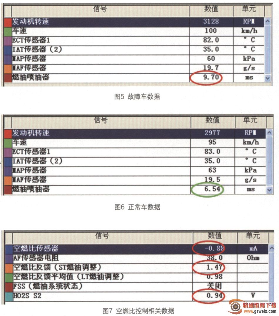 通過對比故障車數(shù)據(jù)(圖5)與正常車數(shù)據(jù)(圖6)發(fā)現(xiàn),在車速、發(fā)動機轉(zhuǎn)速、進氣量、發(fā)動機冷卻液溫度及進氣溫度幾乎相同的情況下,故障車發(fā)動機控制單元計算出的噴油脈寬為9.70 ms,遠遠大于正常值6.54 ms,這也與油耗偏高的故障現(xiàn)象相符。