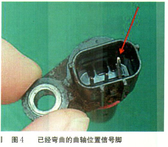 同時(shí)發(fā)現(xiàn)此車的制動(dòng)燈常亮(動(dòng)力PCM包括自動(dòng)變速器的ECU功能),用X431無(wú)法匹配,于是用朗仁PS90進(jìn)發(fā)動(dòng)機(jī)系統(tǒng)一特殊功能一更換ECM/PCM操作,結(jié)果一樣。在等待第二塊ECU的同時(shí),請(qǐng)教同行,并向元征技術(shù)人員咨詢,技術(shù)人員開(kāi)始回復(fù)的是:該車需通過(guò)匹配鑰匙直接解決更換PCM后的匹配問(wèn)題,于是按照指導(dǎo)去做,仍然無(wú)法解決匹配的問(wèn)題。于是直接請(qǐng)求元征技術(shù)人員遠(yuǎn)程操作,結(jié)果開(kāi)始還是一樣,無(wú)法完成匹配工作。后來(lái)解決了匹配問(wèn)題(具體方法總結(jié)再說(shuō)),防盜指示燈不再閃,但是仍然無(wú)法著車,多次打火后顯示:曲軸位置傳感器線路故障。難道是曲軸位置傳感器插頭未插?查看曲軸位置傳感器,結(jié)果發(fā)現(xiàn)插頭插上了。拆下曲軸位置傳感器,一切都明白了:曲軸位置傳感器的一只插腳彎了,插頭根本無(wú)法接觸(圖4)。矯正插腳,打火,成功啟動(dòng)。
